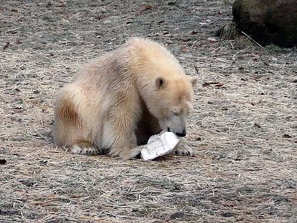 Er pirscht sich also an die Bärin mit dem Eimer an, knurrt kurz und versucht das Spielzeug an sich zu reißen. Keine Frage, dass Flocke sich wehrt! Es kommt zu einer kleinen Rangelei und Rasputin muss geschlagen davon ziehen. Die Niederlage nagt ordentlich an ihm: Zum Abreagieren kaut er verbissen an einem Stück Holz, während Flocke genüsslich an ihrem Schatz weiternuckelt.