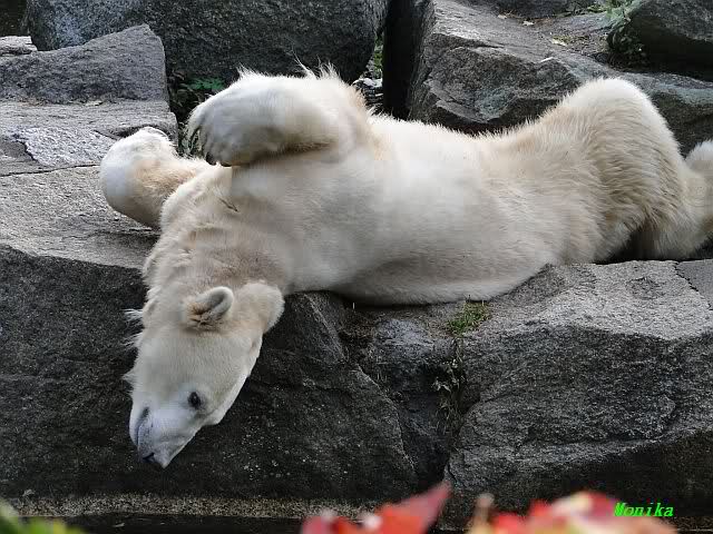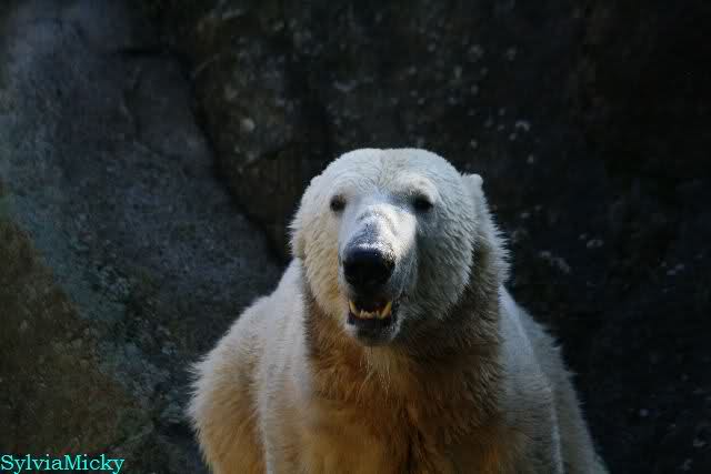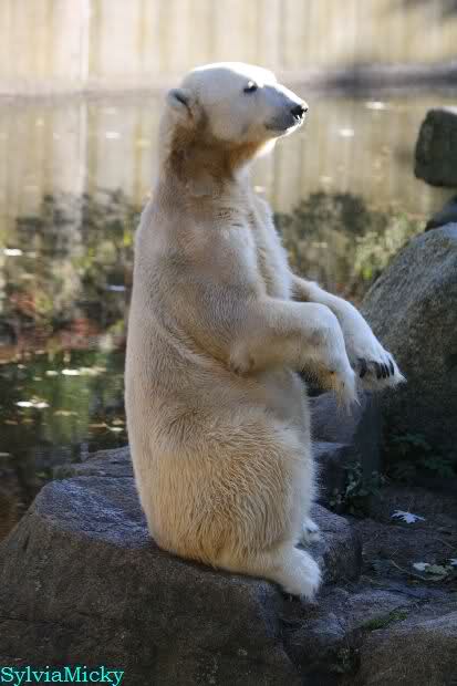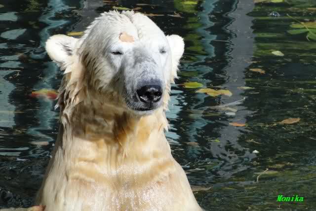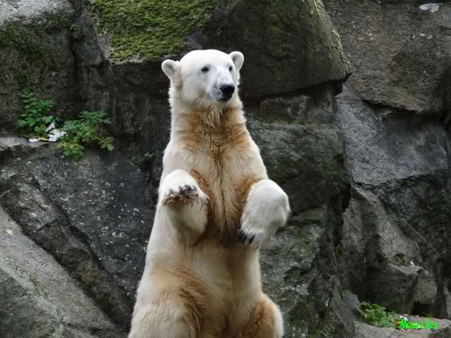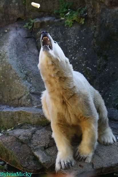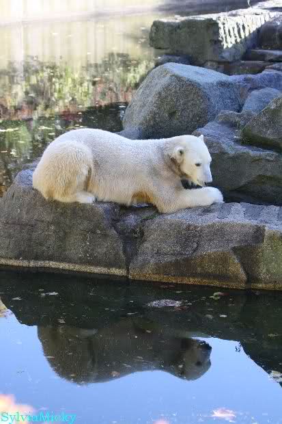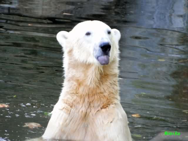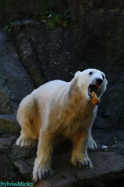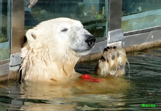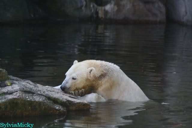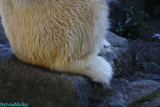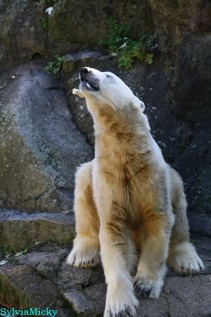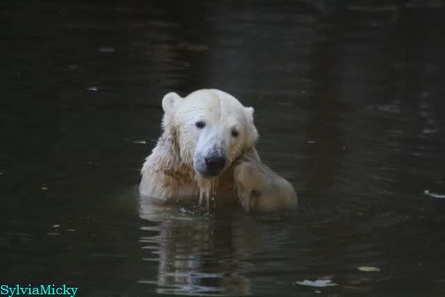 SylviaMicky, Monika - Thank you so much for showing us the latest photos of our boy. Knuti still has his baby face and looks so happy to meet the visitors. I was also happy to see he got a big salmon. Monika, your video makes me sleep better tonight. I love to hear the mantra 'Knut geht's gut'!!! I hope I can hear it every day!