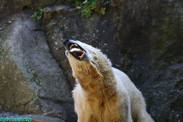 Als er auf die Anlage ging, sah er die Bären nicht. Mein persönlicher Eindruck war, daß er dachte die Bärinnen wären schon weg. Und wollte auf der rechten Seite nach oben gehen. Auf dem Felsen saß aber Tosca. Sie sah ihn und lief runter zu ihm. Knut lief dann an der rechten Seite auf die Anlage. Tosca hinter ihm her. Nancy und Kati kamen auch angelaufen. Es gab dann ein lautes Fauchen von Knuts und Tosca, die Mäuler wurden weit aufgerissen und dann gab es wieder Kopf an Kopf Annäherung. Die drei gingen zurück und Knut lief runter zu seiner rechten Ecke. Er legte sich dann hin und schnaufte. Vielleicht dachte er, einmal schnaufen kann ja nicht schaden.