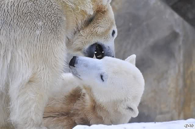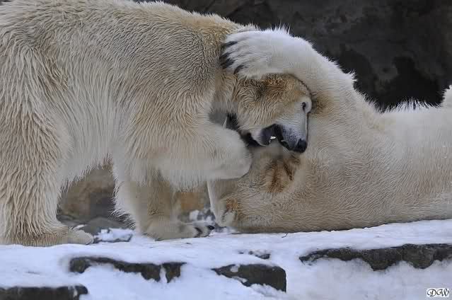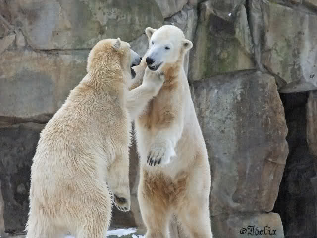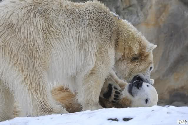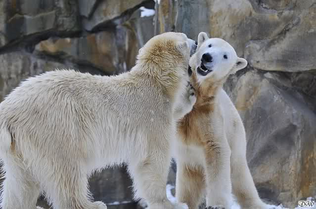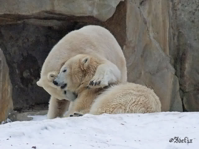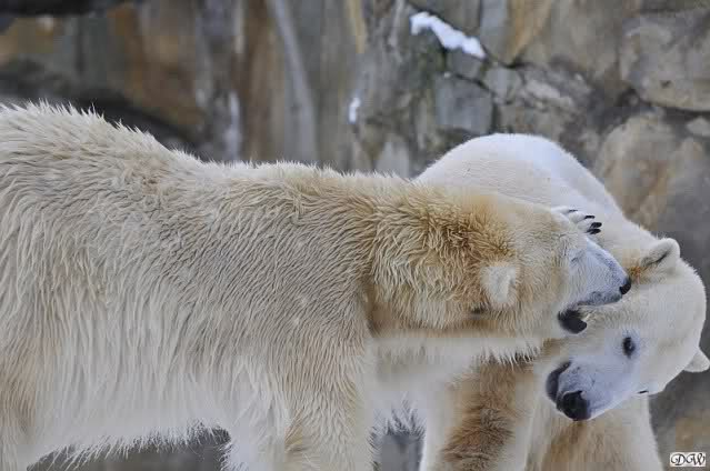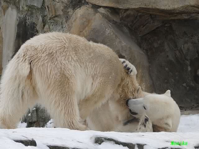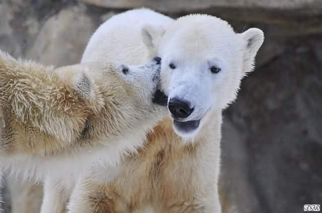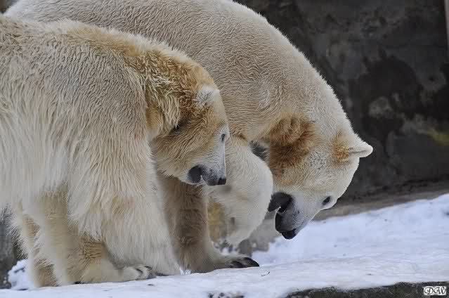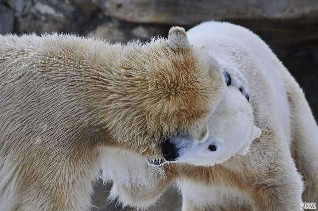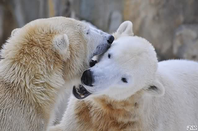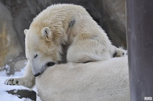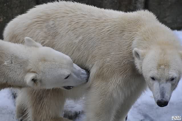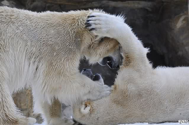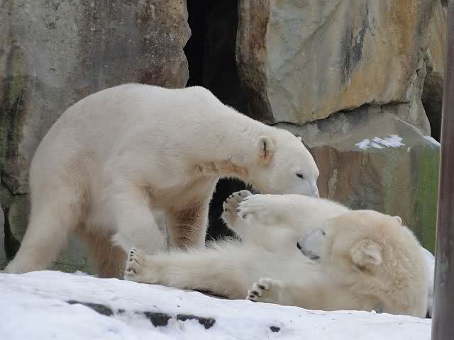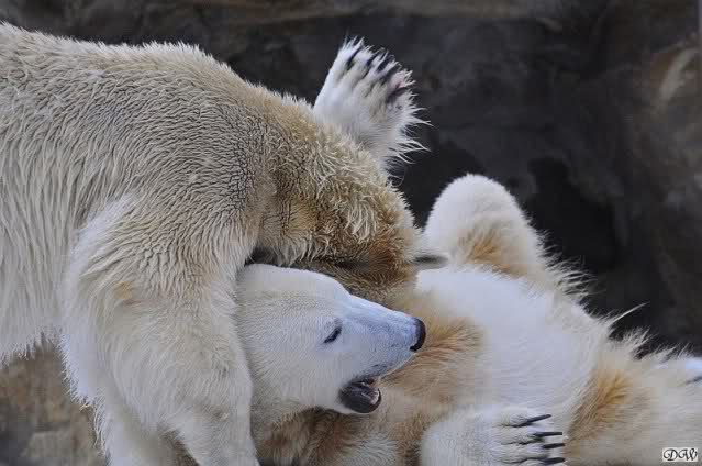 Wieder ein angenehmer Nachmittag mit zwei wunderschönen Bären. Das Power-Girl zog einmal mehr alle Register. Und, wir sahen einen seligen Knut. Gianna spielte lange Zeit mit ihm und die Gesichter der Beiden beim Spielen und Raufen sind rührend anzusehen. Die kleinen Blutspuren auf ihrem und seinem Fell stammen nicht von einer raufbedingten Verletzung sondern von Knut’s Tatze, die blutete.