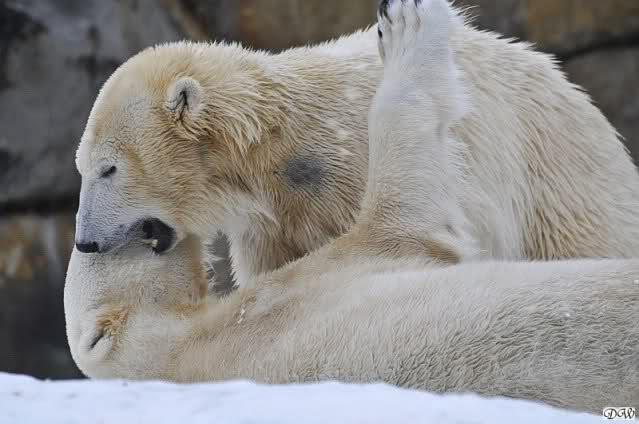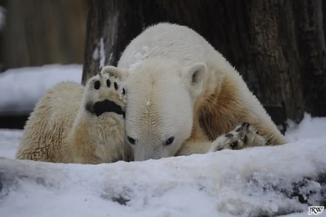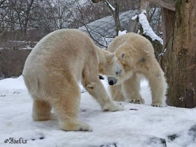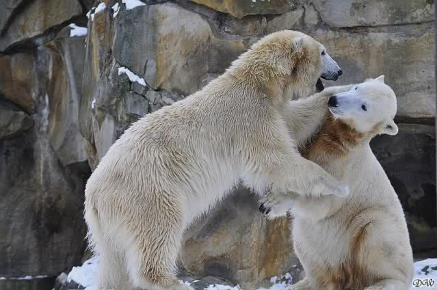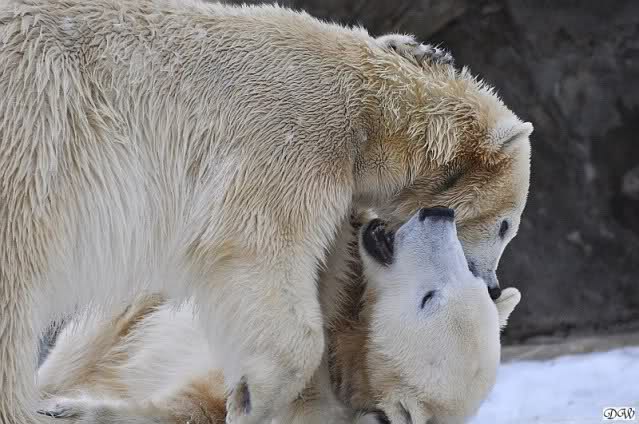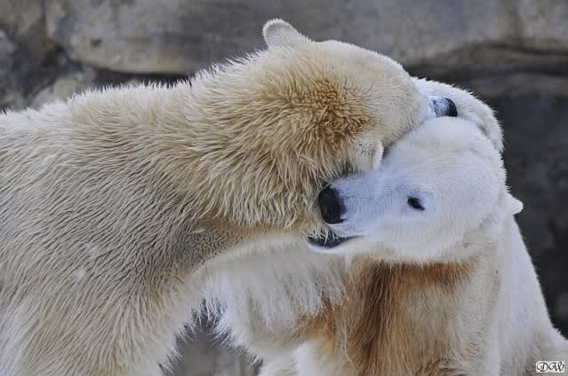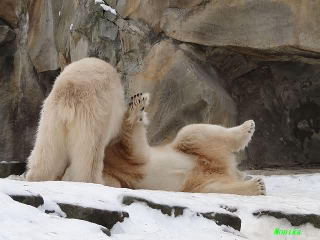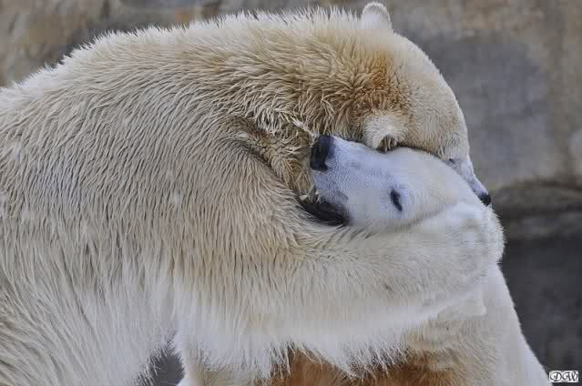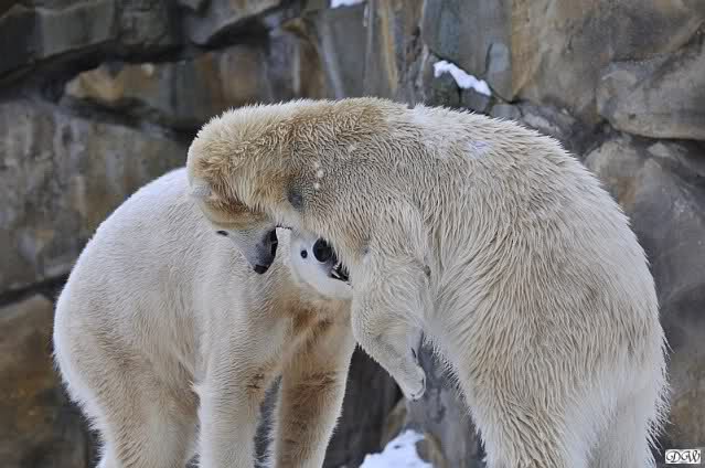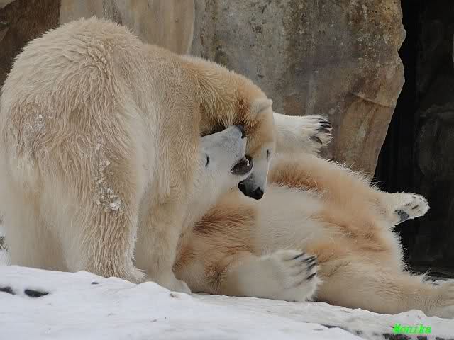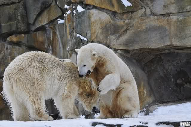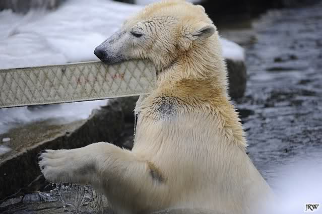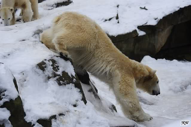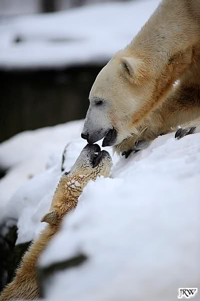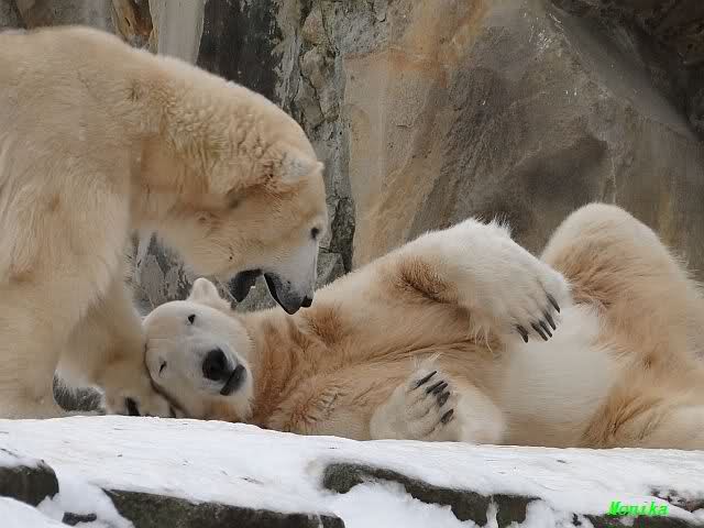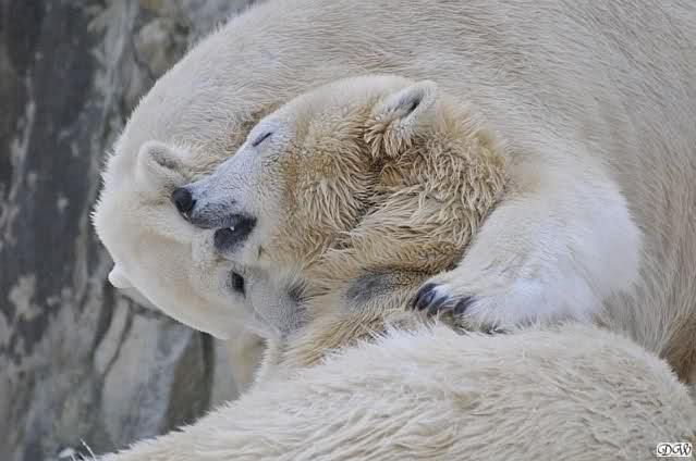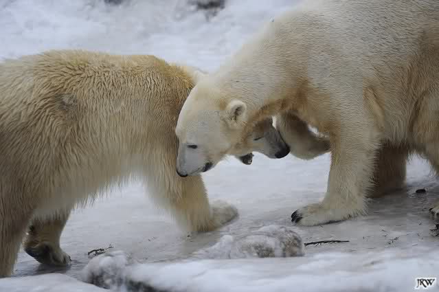 Wieder ein angenehmer Nachmittag mit zwei wunderschönen Bären. Das Power-Girl zog einmal mehr alle Register. Und, wir sahen einen seligen Knut. Gianna spielte lange Zeit mit ihm und die Gesichter der Beiden beim Spielen und Raufen sind rührend anzusehen. Die kleinen Blutspuren auf ihrem und seinem Fell stammen nicht von einer raufbedingten Verletzung sondern von Knut’s Tatze, die blutete.