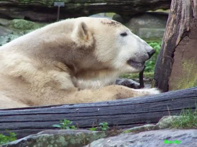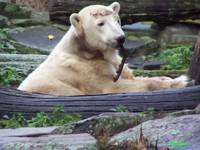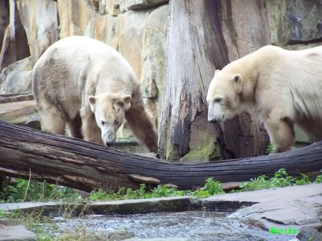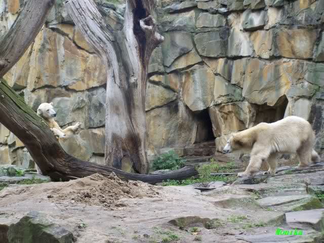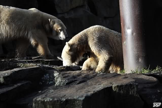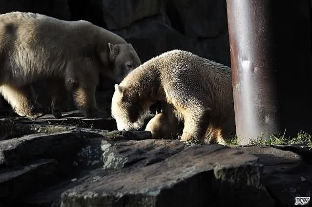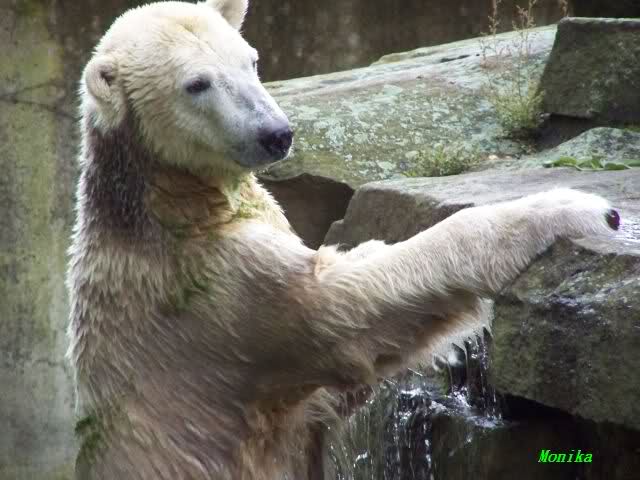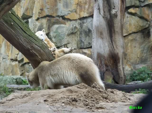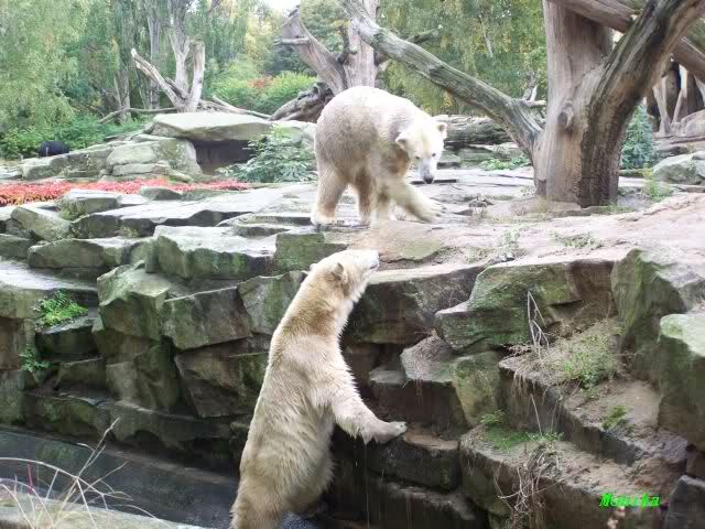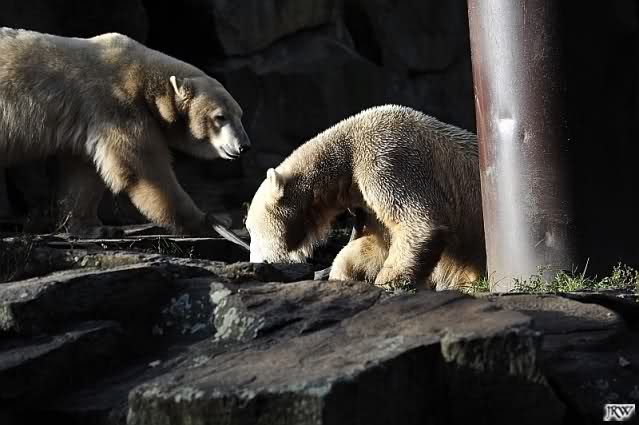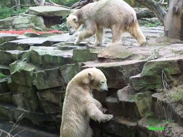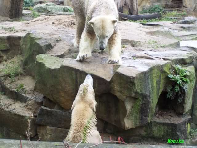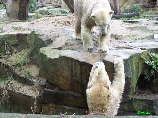 Gianna war im Wasser und Knut hat von oben zugeschaut. Gianna stellte sich im Wasser auf und Knut kam immer näher. Sie haben sich fast mit der Nase berührt und Gianna berührte Knut mit der Pfote. Das sah sehr niedlich aus. Leider war meine Kamera wieder zu langsam, um diesen Augenblick festzuhalten. Aber ich bin mir sicher, wir werden hier heute noch einige Fotos davon zu sehen bekommen.