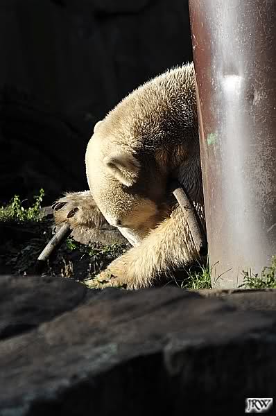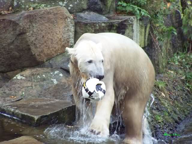 Heute Vormittag ließen es die beiden Bärchen ruhig angehen. Knut hat auch heute im Wasser gespielt und auch mal den Ball zu den Zuschauern geworfen.Er hat bei seiner Spiellust gar nicht bemerkt, dass ihm Herr Henkel einen Fisch zuwarf, der im Wasser landete. Aber er hat ihn später dann doch noch gefunden. Nach der Fütterung kam Gianna zielgerecht auf Knut und seinen Kürbis zugelaufen. Und dann wieder das gleiche Spiel. Knut ließ den Kürbis fallen und Gianna fraß ihn.