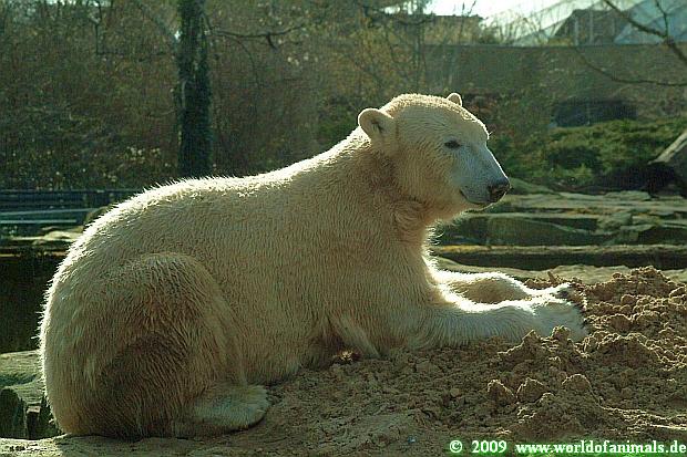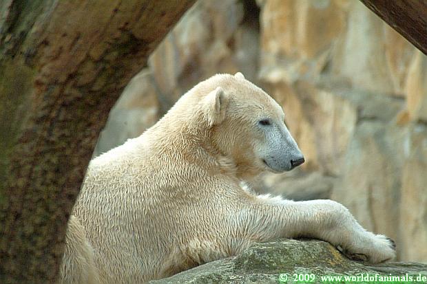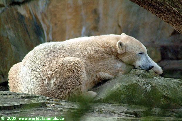 Dann ging ich zu Knut. Als ich einige Besucher begrüßen wollte, bekam ich gleich die Mahnung, leise zu sein, denn der junge Herr schliefe. In der Tat hatte Knut es sich im hinteren Teil seiner Anlage gemütlich gemacht und hielt ein Nickerchen. Er wurde kurz wach, schaute, was es da zu reden gibt und schlief dann weiter.