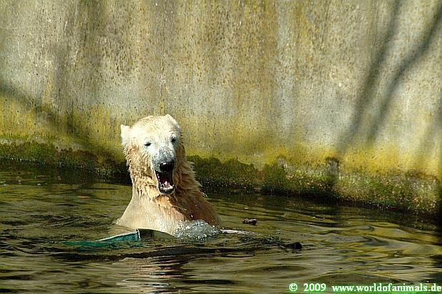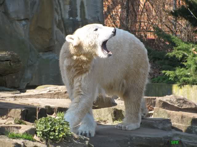 Nach der Fütterung begann Knut wieder hin und her zu laufen. Ich hatte den Eindruck, daß er die Fütterung als Snack ansah und auf Grund der Sommerzeit auf seine eigentliche Fütterung wartete.