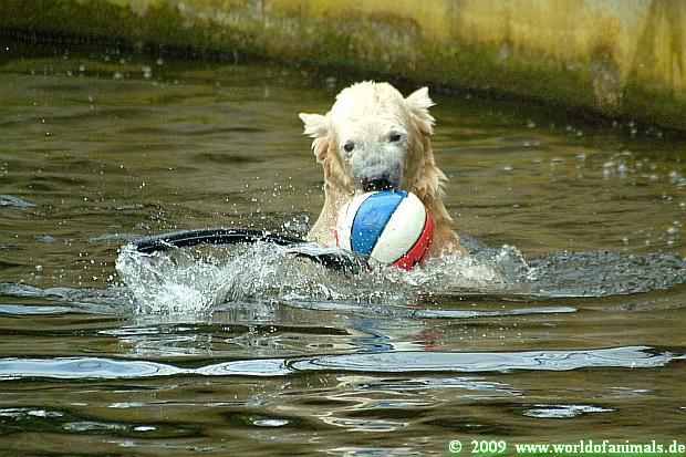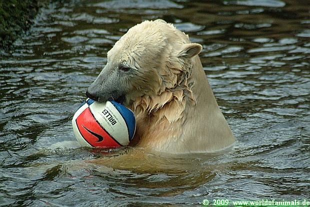 Dann ging ich wieder zu Knut. Der war gerade wieder dabei, sein Nackthuhn zu beißen, zu verprügeln – und auch Prügel einzustecken. Knut spielte lange damit und war wirklich unermüdlich. Dann war sein blau-weiß-roter Basket-Ball an der Reihe, wurde ausgepresst und hin und her geschleudert. Knut versuchte auch wieder, mit den Besuchern Ball zu spielen.