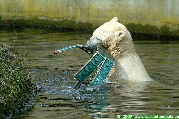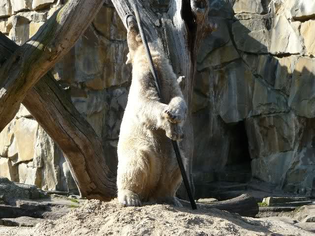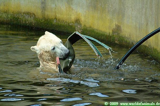 Als ich nach der Fütterung in den Zoo kam, war Knut noch lange mit einem Knochen beschäftigt den er zur Fütterung bekam. Er nahm ihn und ließ ihn in den Wasserfall fallen, da der Knochen voller Sand war. Schlauer Bär.