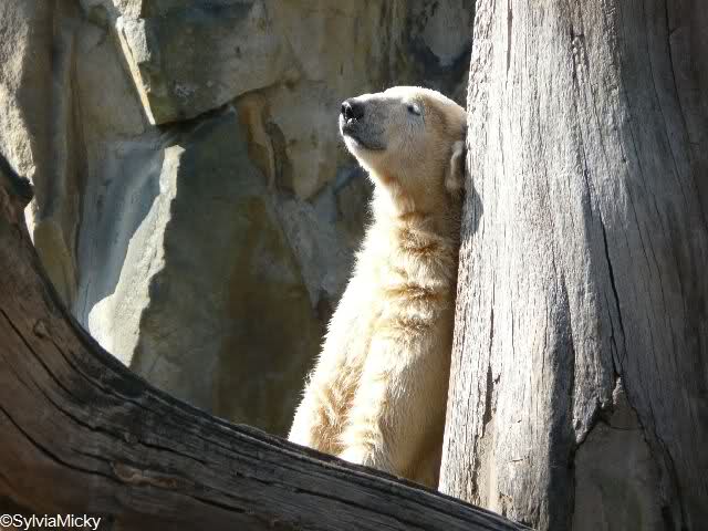 Kurz vor halb elf ging ich dann zur Fütterung der Eisbären. Heute gab es etwas Interessantes zu sehen. Alle drei Damen gingen freiwillig ins Wasser und das noch vor der Fütterung! Lars lag bäuchlings am Ufer und drehte uns seinen hübschen Allerwertesten zu.