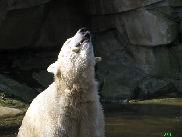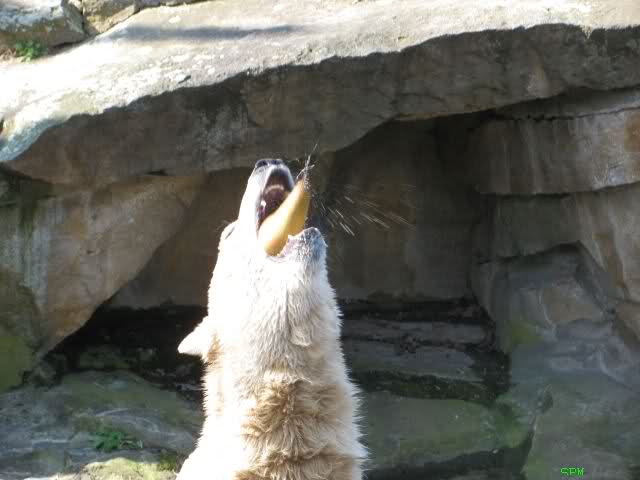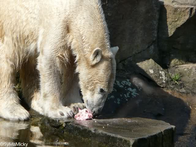 Die Fütterung machte heute Herr Röbke. Sie war sehr sehenswert. Denn heute waren bei den Eisbären die Rollen mal vertauscht! Der sonst ständig hungrige Lars legte heute vornehme Zurückhaltung an den Tag. Die Damen hingegen sprangen immer wieder ins Wasser, dass es eine wahre Freude war, und holten sich ein Stück Fleisch nach dem anderen.
