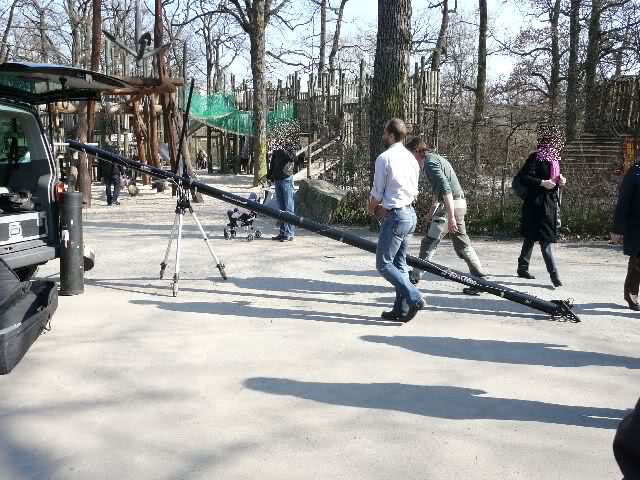 Am Nachmittag kam ein Wagen vom RBB angefahren. Die Mitarbeiter bauten ein riesen Schwenkarm für eine Kamera auf. Knut kam sofort an und schaute sich die Sache sehr interessiert an. Es muß ja nicht immer ein Schwenkarm sein, ein Ochsenschwanz z. B. würde ihn auch ablenken und beschäftigen.