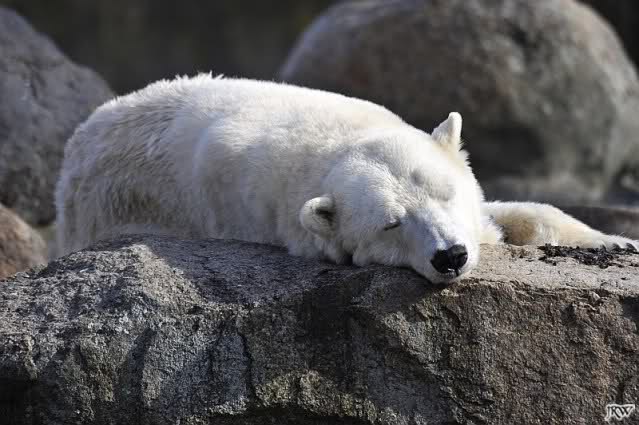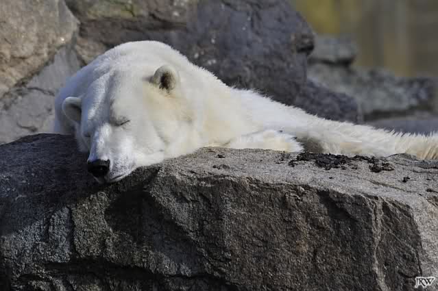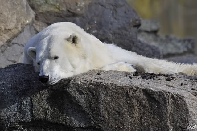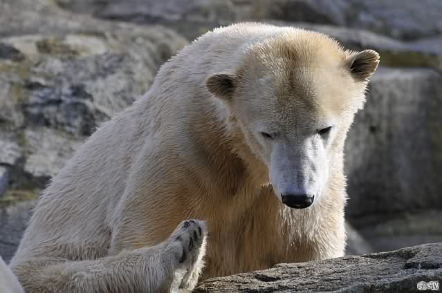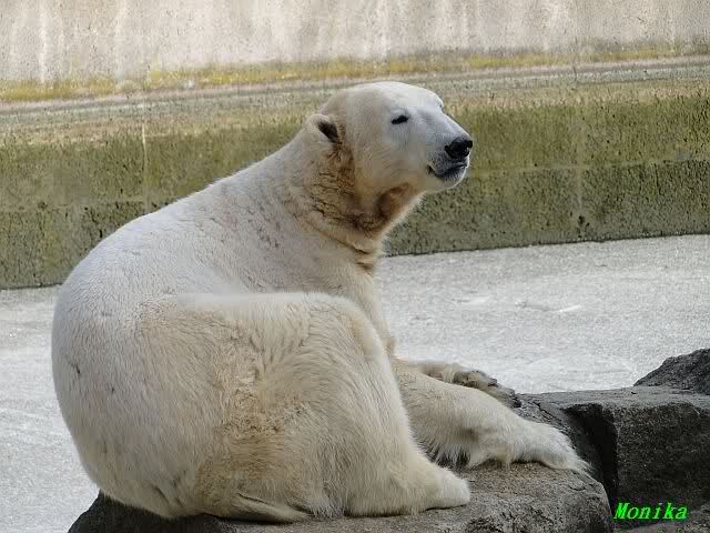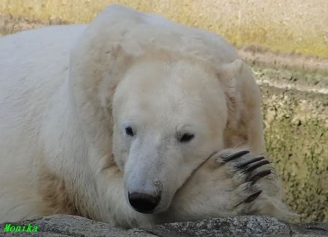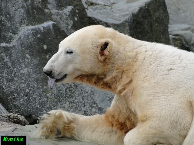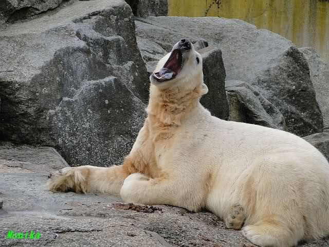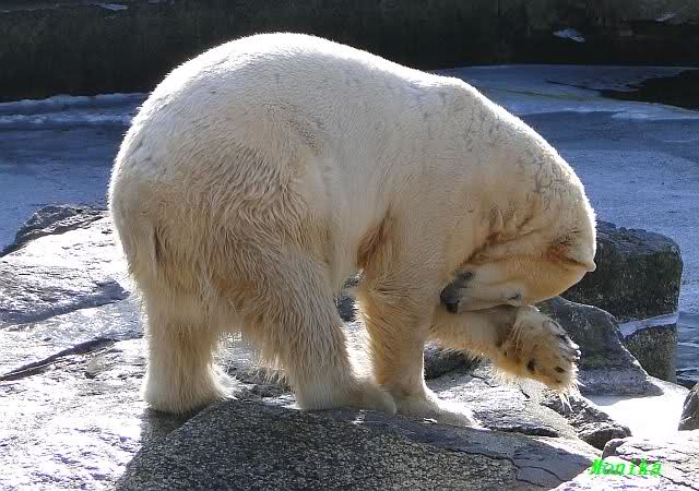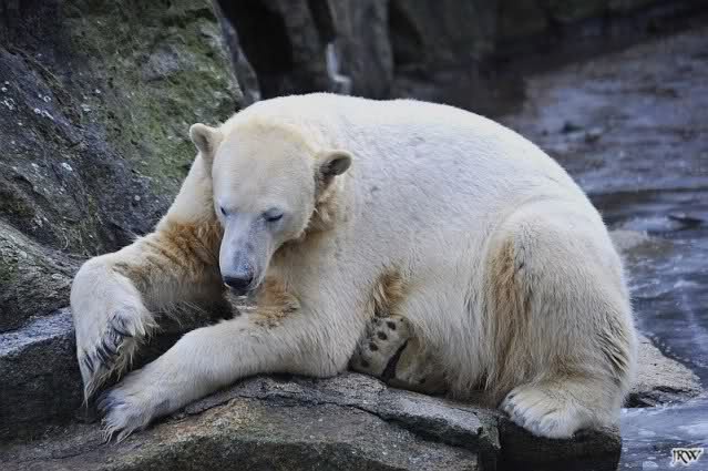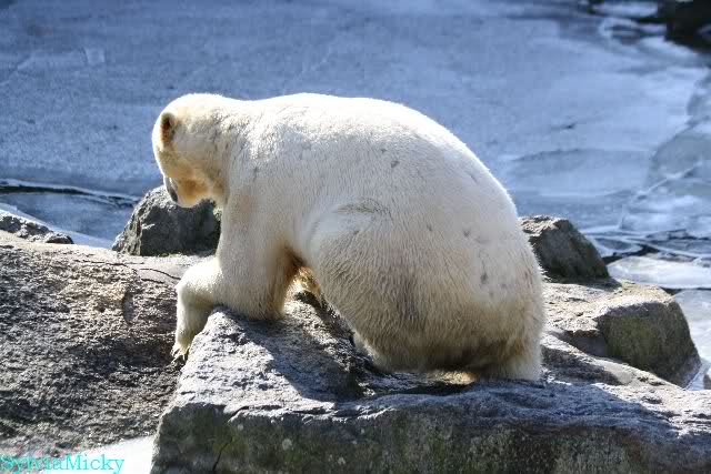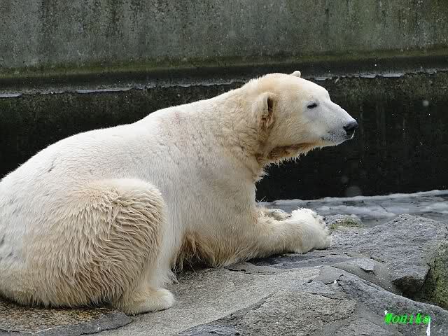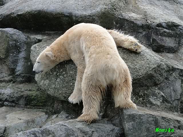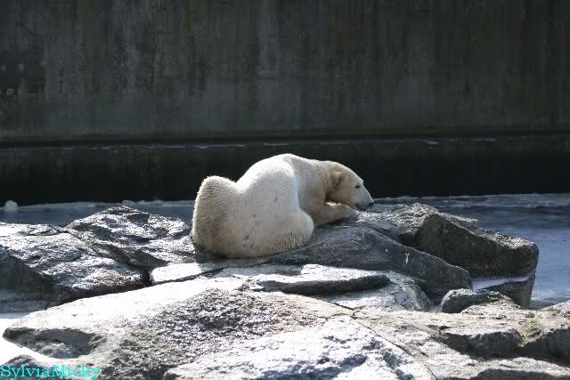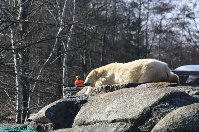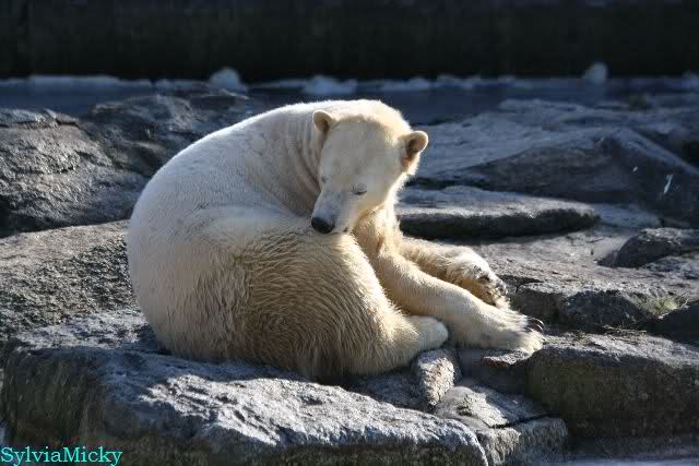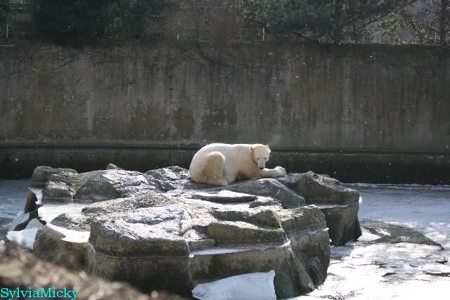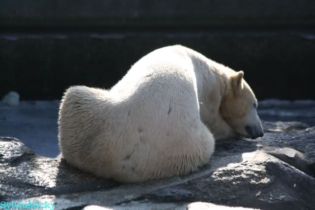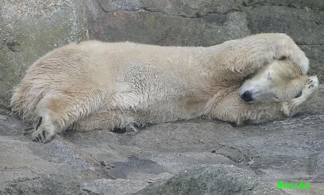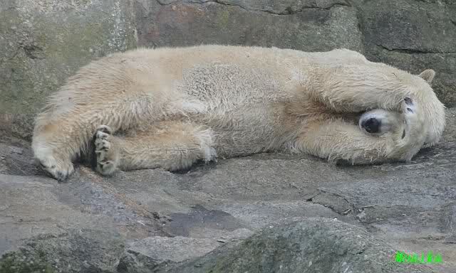 Ich war nach der Fütterung im Zoo. Knut lag auf der linken Insel. Da lag er bis die Drei rein gingen. Er nahm verschiedene unbequeme Liegestellungen ein.