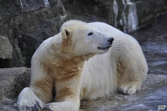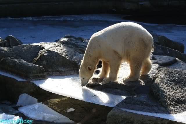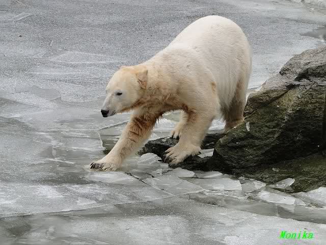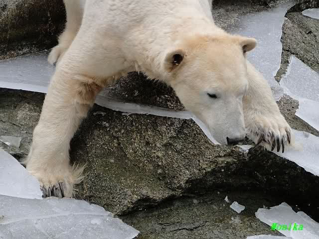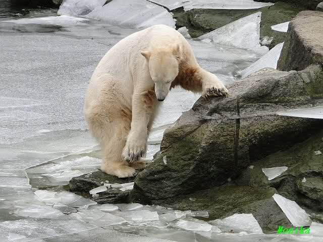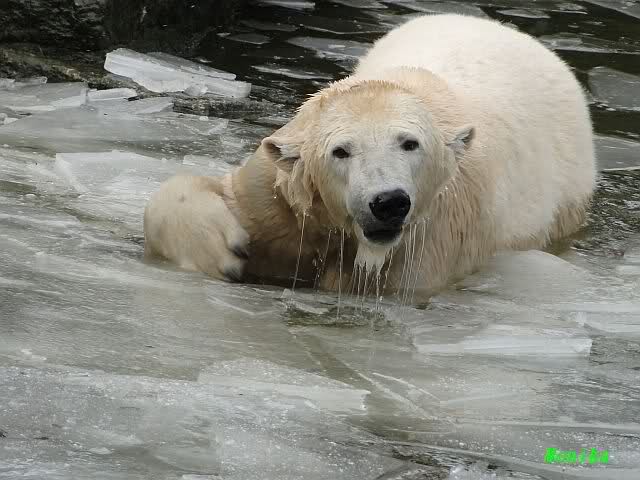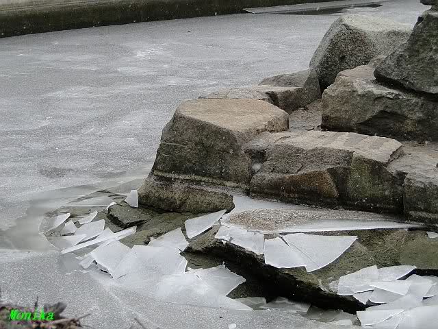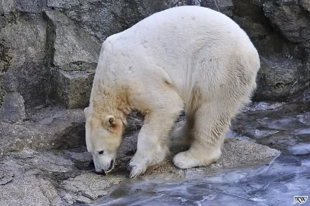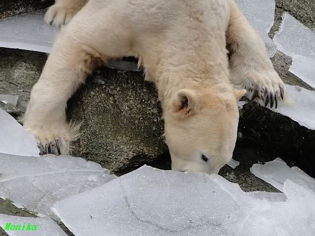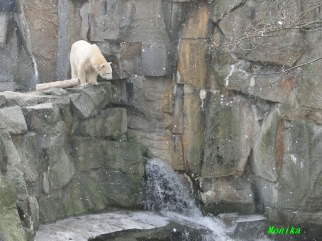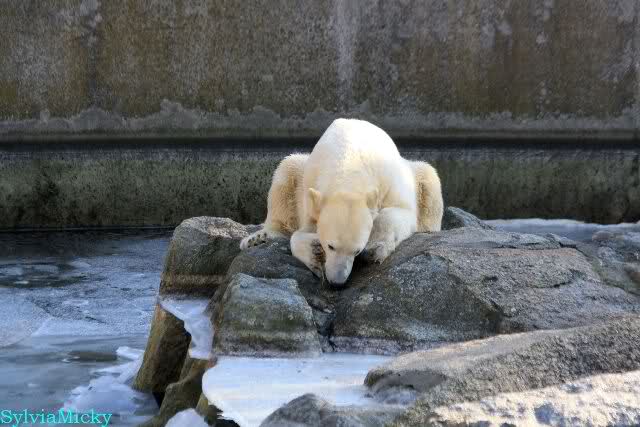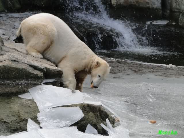 Heute Morgen war es sehr kalt und schneite leicht. Es hat sich eine dicke Eisschicht im Wassergraben des Eisbären-Geheges gebildet. Es wurde schon viel Wasser abgelassen und später wieder zugelassen, damit sich die Eisschicht auflöst.