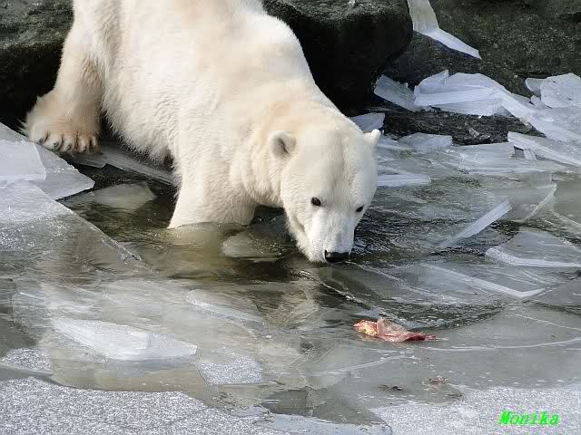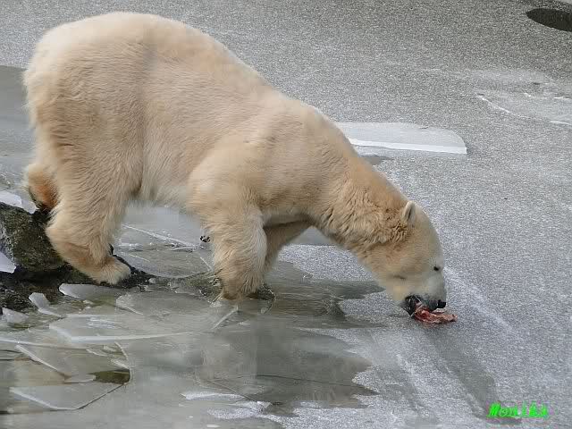 Bei der Fütterung kamen die Mädels Knut sehr nahe, was ihm heute gar nicht gefiel. Das Fleisch fiel meist auf das Eis und auch das gefiel ihm nicht. Also trabte er ganz nach hinten in die Ecke und wartete dort. Frau Weckert rief Knut einige Male laut, aber er kam nicht. Damit er auch noch etwas abbekommt, hatte sie ein Einsehen und folgte Knut nach hinten.