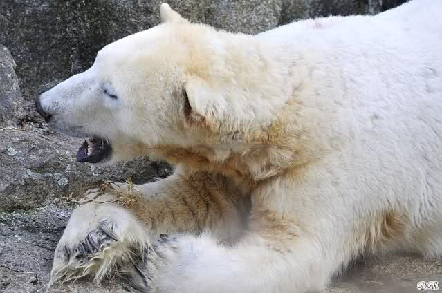 Kalt war es trotzdem. Nancy genoss die Ohren von Tosca und fand es auch nicht schlecht, als diese ihr die Wange schleckte. Kati verhielt sich den größten Teil des Nachmittags ruhig und genoss teilweise schlafend die Sonne. Knut schaute zwar öfter zu den über ihm liegenden Bärinnen, spielte aber unverdrossen weiter mit einem winzigen Zweiglein, leckte immer wieder die Lachstatzen (die Knutitis hatte heute wieder große Lieferung von Leckereien im Bärenhof). Ab und zu ein Nickerchen durfte auch nicht fehlen.
