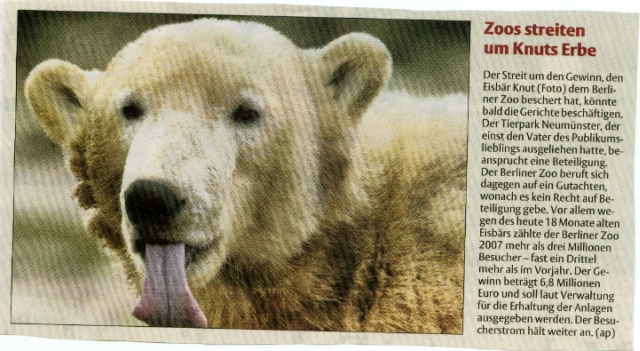 Neuerdings hört und liest man nämlich, dass „die Zoos“ beginnen umzudenken. Ob es an den Euros liegt, die die vielen Menschen bringen, die - dank Knut - neuerdings wieder zu den Tieren gehen?
