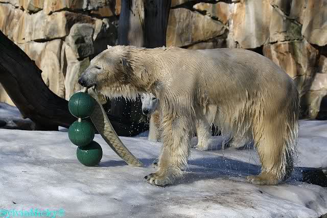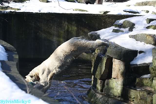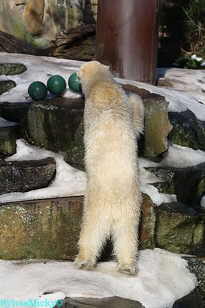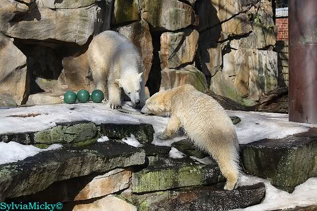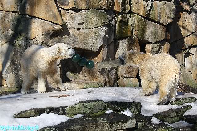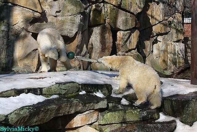 Bei herrlichem Sonnenschein und Temperaturen um die 7° spielten beide Bären am Vormittag ausgelassen im Wasser und mit den Pflanzkugeln. Mal hatte Knut sie, mal Gianna. Dann gab es wieder Tauziehen, wo mal Knut und mal Gianna gewann.
