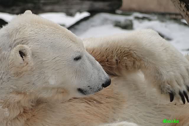 Bei KUNO (so nannte Herr Dr. B. ihn gestern) und Gianna war heute Nachmittag Antistimmung. Wir sahen etwas, das wir lange nicht mehr zu sehen bekamen. Knut lief auf und ab als warte er auf die Fütterung. Nur war diese schon seit einer Stunde vorbei. Als er einsah, dass es nichts brachte, legte er sich hin und leckte sich genüsslich die Lachspfoten.