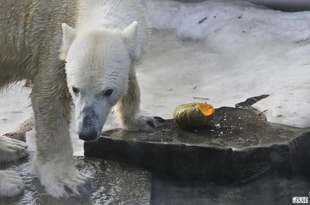 Today we also delivered Patrizia’s pumpkins. Gianna got hers behind the scenes and Knut his after his salmon. He got it out of the water and immediately started to eat it. Since a piece got stuck in his teeth, he tried to get it out and lost time. Gianna came, saw the piece of the pumpkin and in no time it was hers. Knut was not amused but Gianna enjoyed the stolen piece tremendously. Patrizia, thank you again. Both bears had a ball with them.