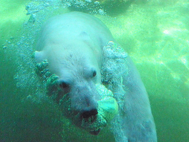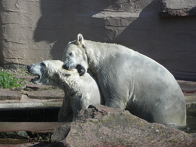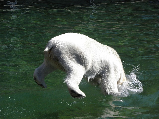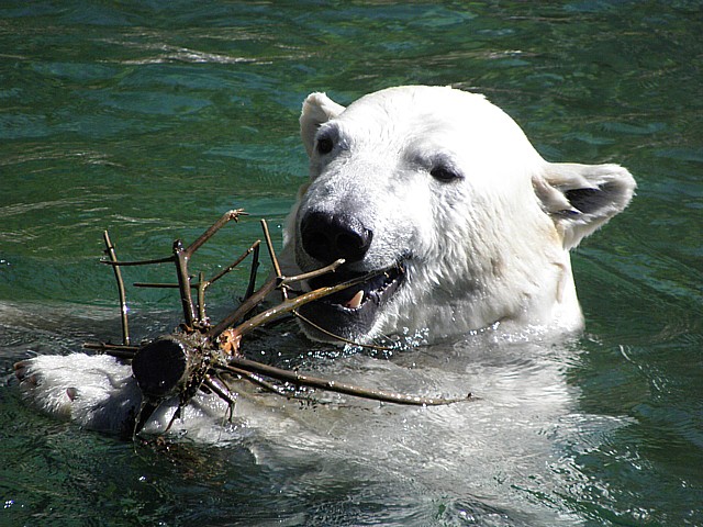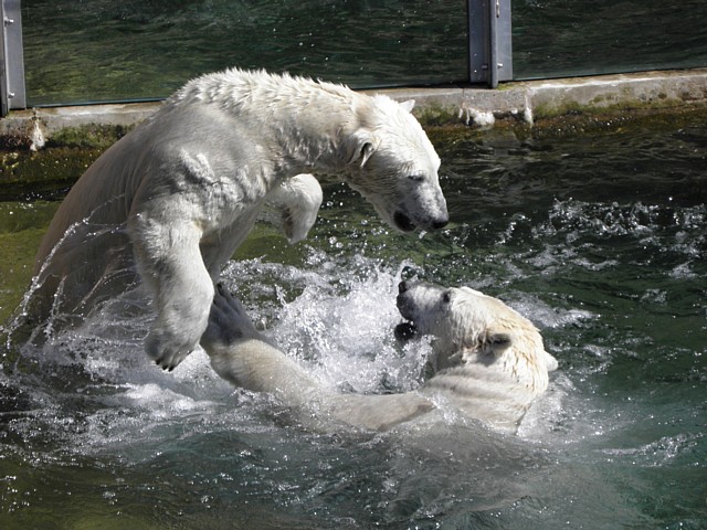 Wir besuchten dann nochmal Flocke und Rasputin und trauten unseren Augen kaum: Flocke hatte sich aufgerafft und war im Wassser, Rasputin natürlich auch. Die beiden waren ganz aufgedreht, tollten im Wasser herum, waren oft an den Scheiben bei den Zuschauern.