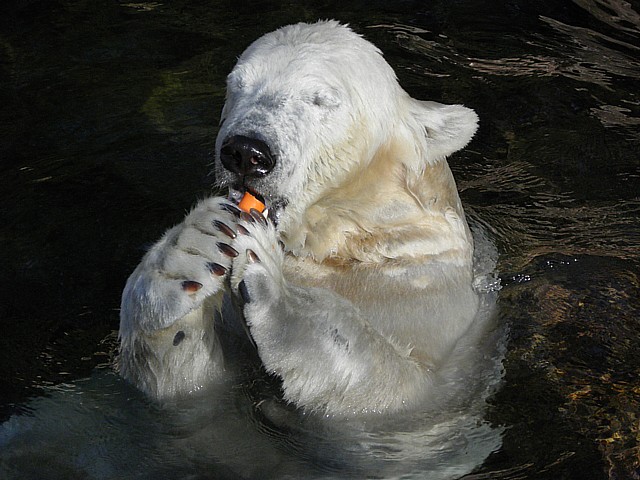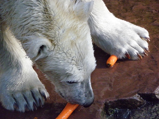 Bei der Fütterung war Rasputin zuerst in der Höhle verschwunden, wahrscheinlich hat er drinnen schon etwas bekommen. Der Pfleger, der Flocke fütterte, warf das Futter (Fleisch, Rüben, Fische, Salat ...) in das Gehege, so dass es schön verteilt war. Er wartete immer, bis Flocke in aller Ruhe hätte fressen können.