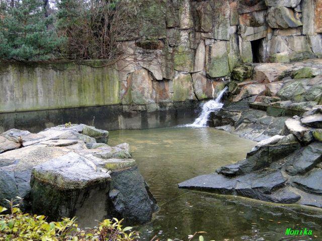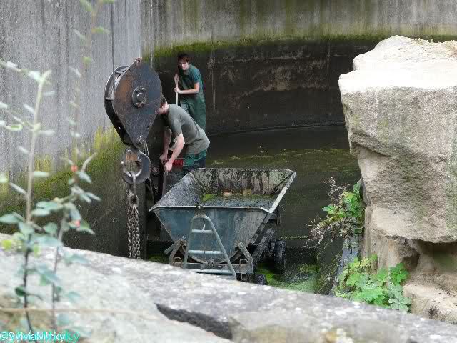 Bei den Ottern gab es große Aufregung. Ein Junges war in den vorderen Graben gefallen und konnte den Weg zurück nicht finden. Laut fiepend schwamm es hektisch hin und her, die Großen fiepten auch um ihn wieder auf den richtigen Weg zu locken. Endlich war es geschafft. Drei der Großen zerrten es an Land und blitzschnell verschwand der Kleine in der Höhle. Einer der Großen hatte ein "Friemelchen" und weil die anderen es auch haben wollten, klemmte er sich in einen Felsspalt und spielte damit.