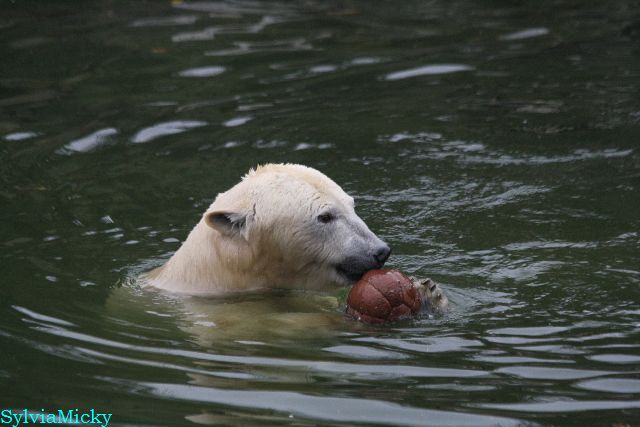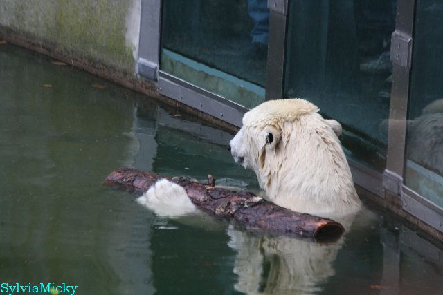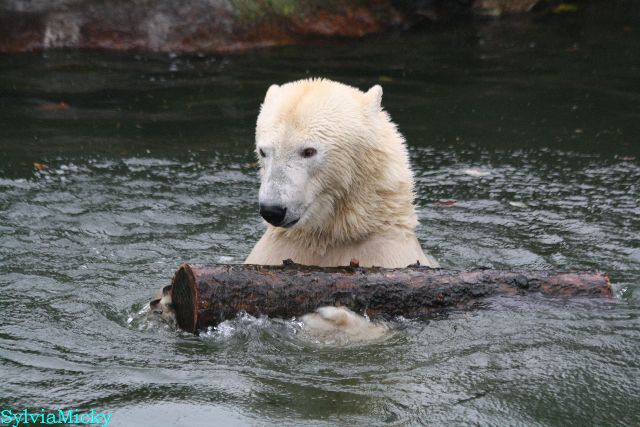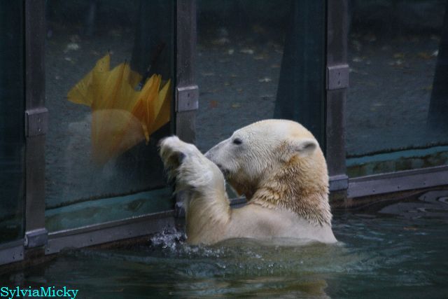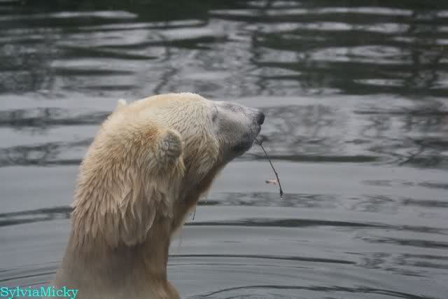 Heute früh war Knut schon im Wasser. Er spielte wieder mit einem Beschäftigungszweiglein, welches er auch den Besuchern zeigte. Man sah ihm an, wie sehr er den großen Pool genoß.