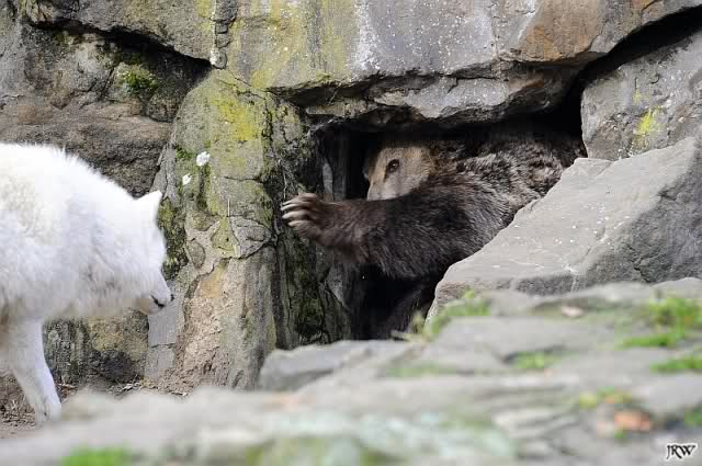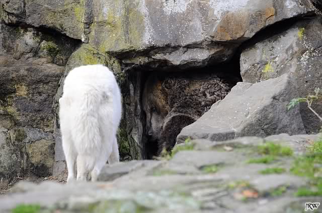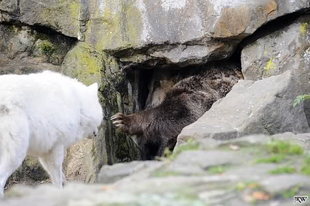 Die Wölfe hatten Langeweile und beschlossen Petzi zu ärgern, möglicherweise war ja in ihrer engen Höhle noch etwas Leckeres abzustauben ...