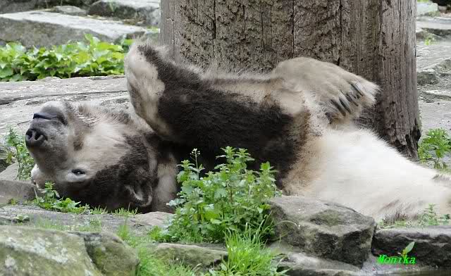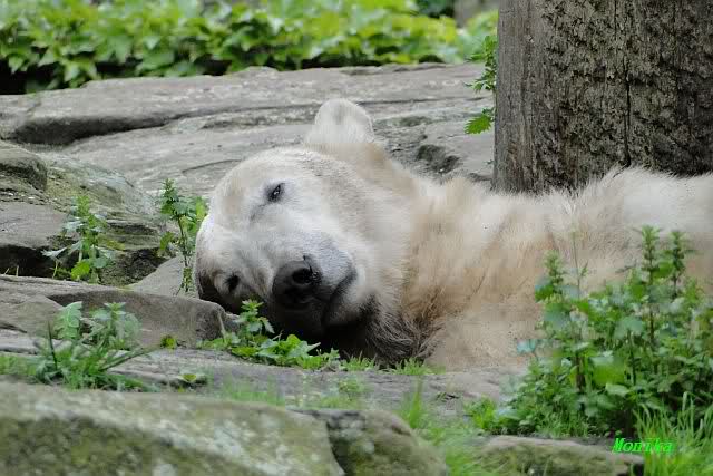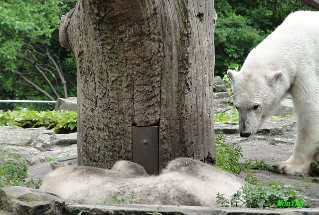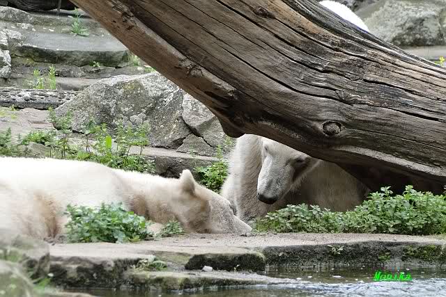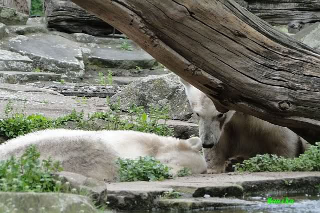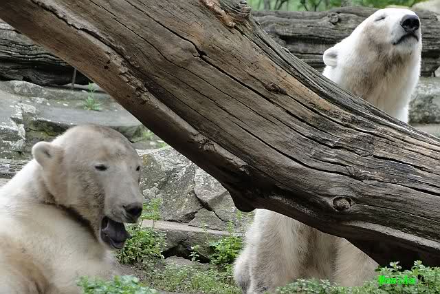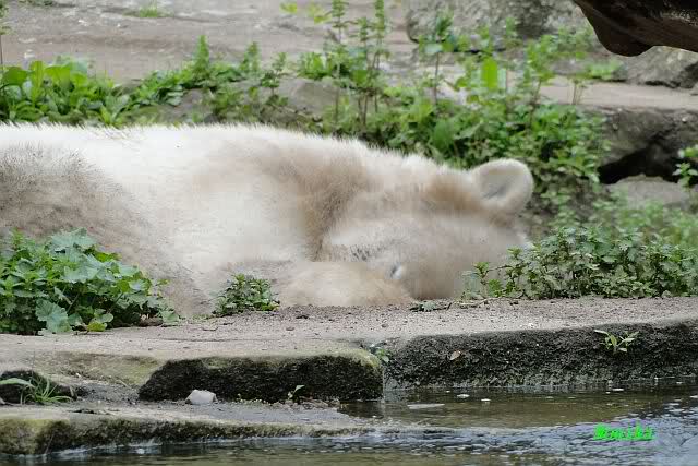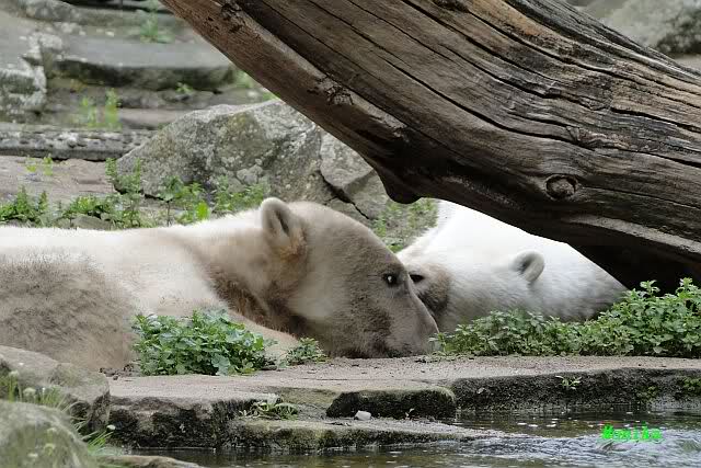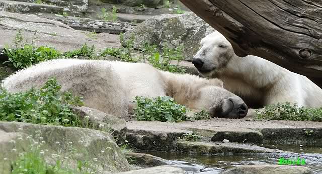 Den heutigen Vormittag kann man mit zwei Worten beschreiben: Müde Bären. Es wurde viel geschlafen. Zweimal ist Gianna ganz dicht zu Knut gerückt und hat ihn beim schlafen beobachtet. Er war so müde, dass er nicht mal aufgestanden ist.