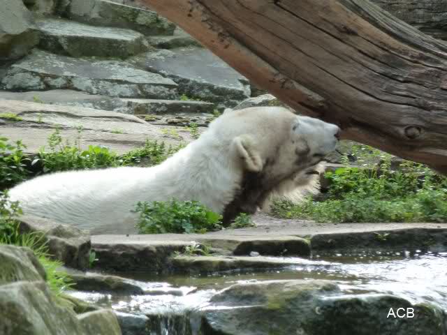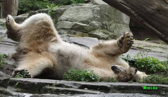 Als Knut erwachte, machte er wieder mal Bären-Yoga. Kurz vor der Fütterung ging er ins Wasser.