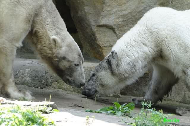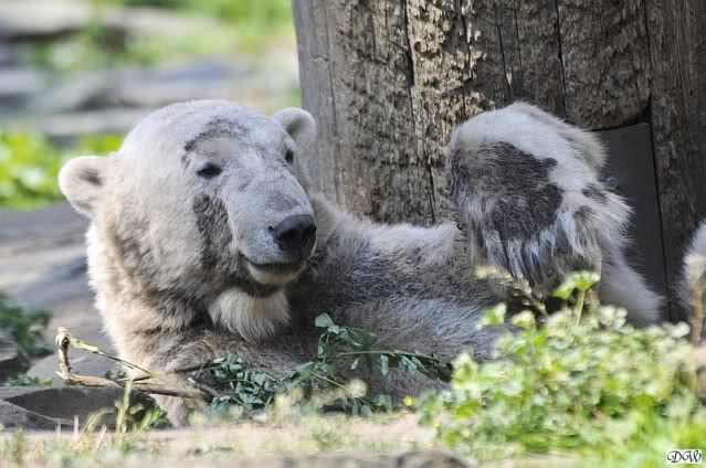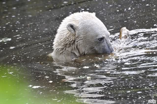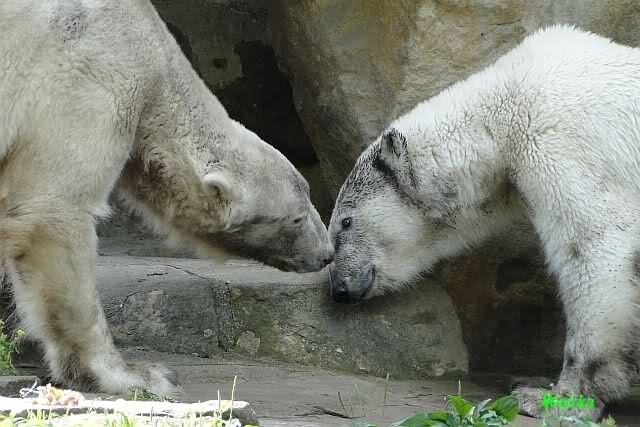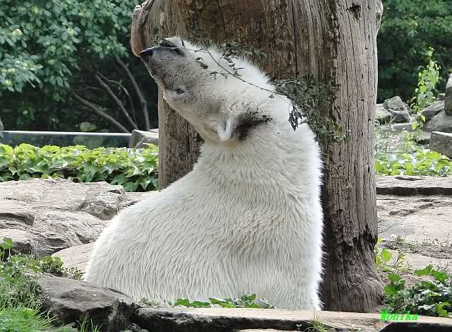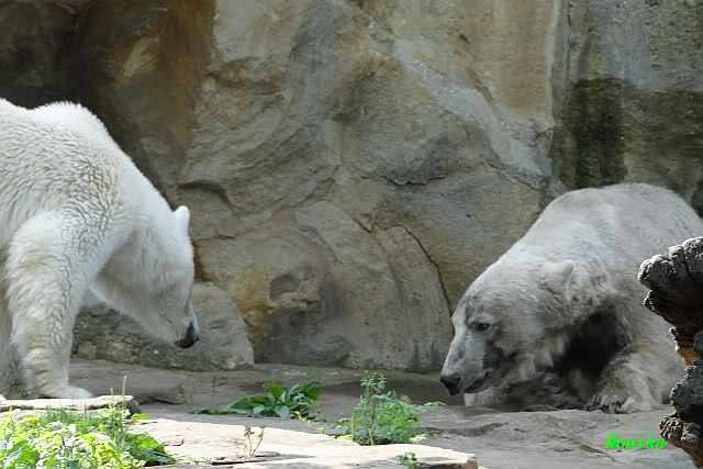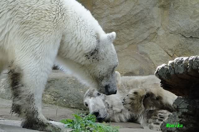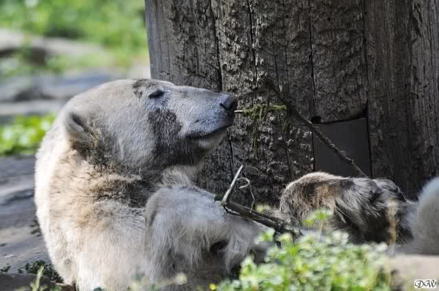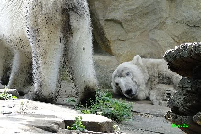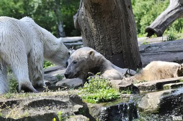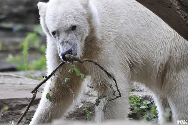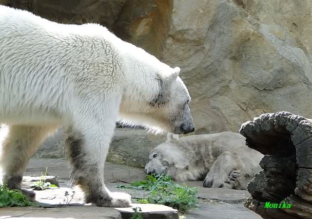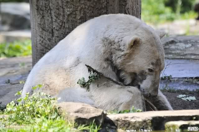Da meine Wohnung derzeit einer Sauna gleicht, bin ich am Spätnachmittag noch einmal in den Zoo gegangen. Leider hat Knut dann nicht mehr mit dem Ball gespielt. Er war nämlich müde. Er schlief und Gianna friemelte mit dem Zweig. Sie suchte aber auch immer wieder seine Nähe. Manchmal ließ er es zu, aber er zeigte ihr auch mal die Lippe.