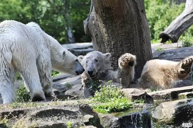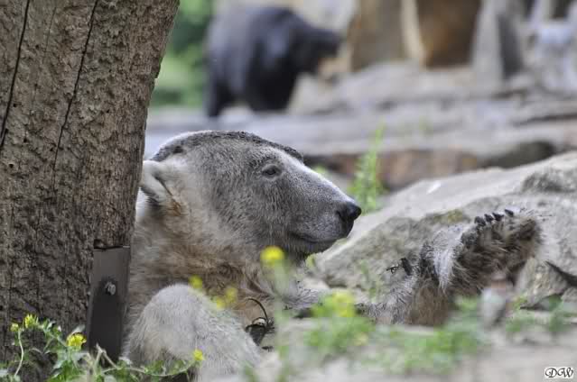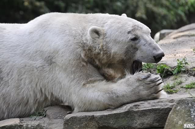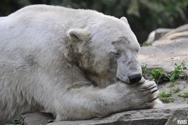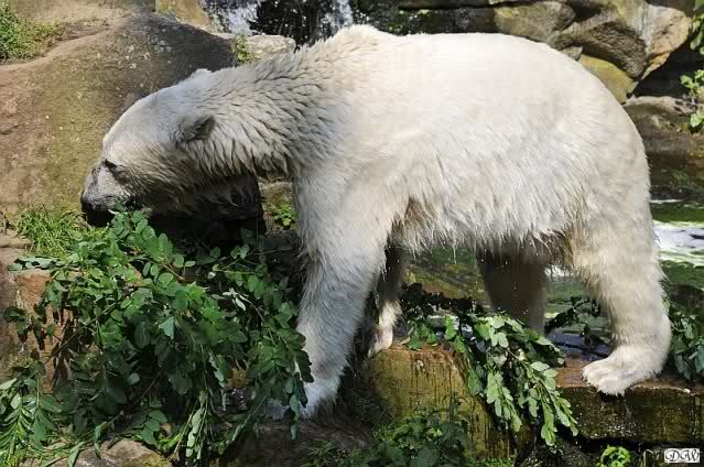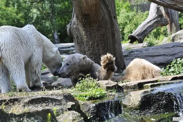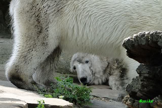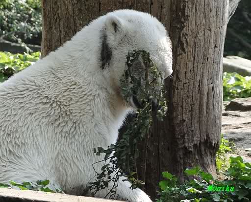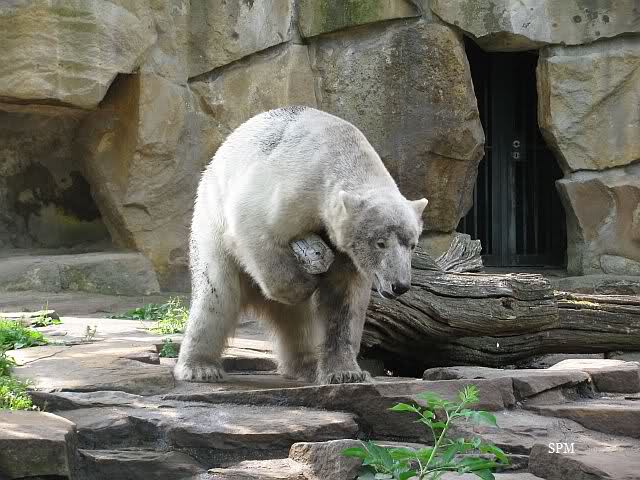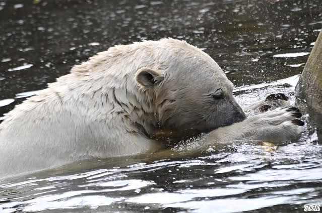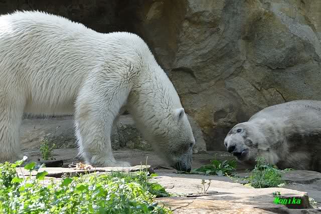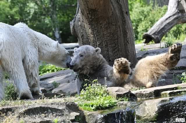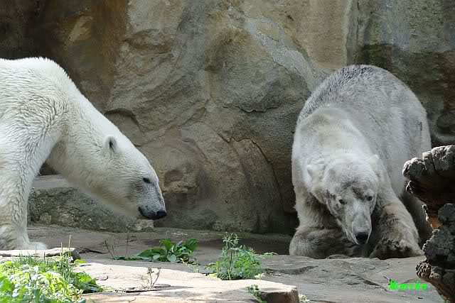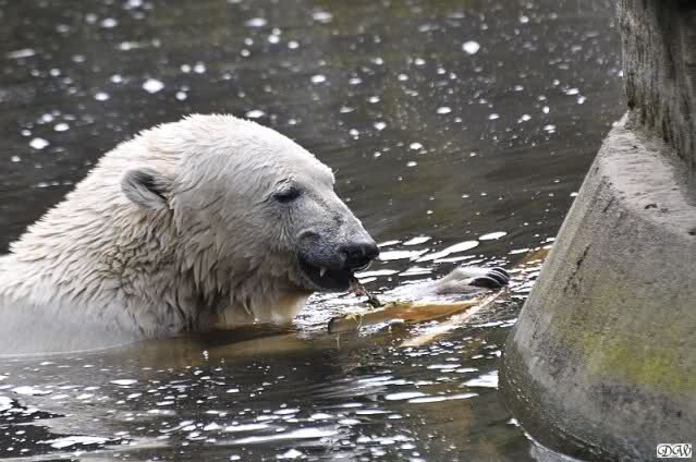 Da meine Wohnung derzeit einer Sauna gleicht, bin ich am Spätnachmittag noch einmal in den Zoo gegangen. Leider hat Knut dann nicht mehr mit dem Ball gespielt. Er war nämlich müde. Er schlief und Gianna friemelte mit dem Zweig. Sie suchte aber auch immer wieder seine Nähe. Manchmal ließ er es zu, aber er zeigte ihr auch mal die Lippe.