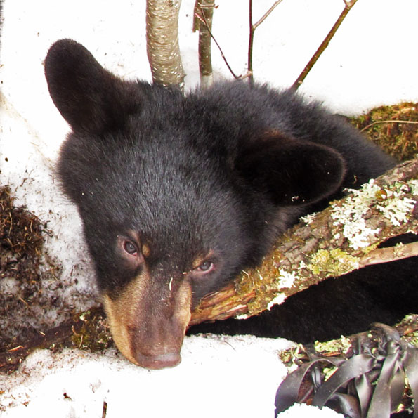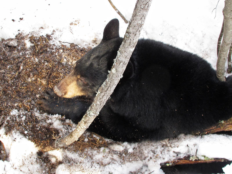 Zwei Dinge geschahen gestern die es wert sind zu erzählen. Als Lynn Lily streichelte und an seiner Hand roch war da kein Geruch zu merken. Sie ist ungefähr seit 5 Monaten in der Höhle und riecht sauber. Bären, besonders Männchen, haben während der Paarungszeit einen moschusartigen Geruch, besonders auf dem Kopf und hinten am Hals. Das sind die Teile die sie an Bäumen reiben als Teil der Duft Kommunikation. Lynn war nicht überrascht über das Fehlen von Geruch an Lily zu dieser Jahreszeit. Eigentlich riechen Bären für uns niemals schlecht es sei denn sie haben sich in irgendetwas Stinkendem gewälzt.