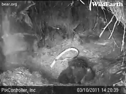 Heute war bis zum Nachmittag ein ruhigerer Tag in der Höhle. Dann bracht das Spiel aus. Dasselbe in Ted und Luckys Höhle. Wir würden von all dem keine Ahnung haben ohne die Höhlen Kameras. Wird Lily mit den Jährlingen Faith und Jason und der 2-jährigen Hope nächsten Winter in ihrer Höhle spielen? Wir hatten keine Ahnung, dass Bären so viel in ihren Höhlen spielen, wenn sie doch angeblich Energie sparen. Wir haben solches in Jahrzehnte in denen wir uns den Höhlen in der Wildnis näherten nicht erlebt. Die Bären waren wahrscheinlich durch unsere Annäherung gewarnt und hatten das Spiel abgebrochen.