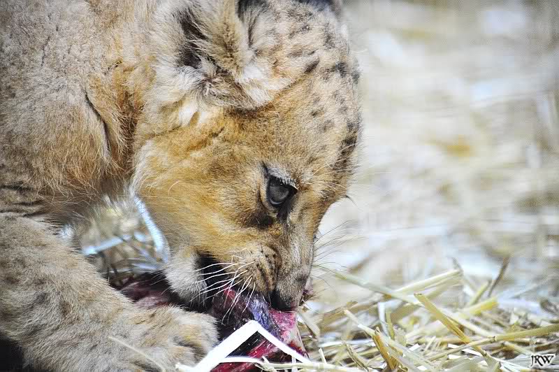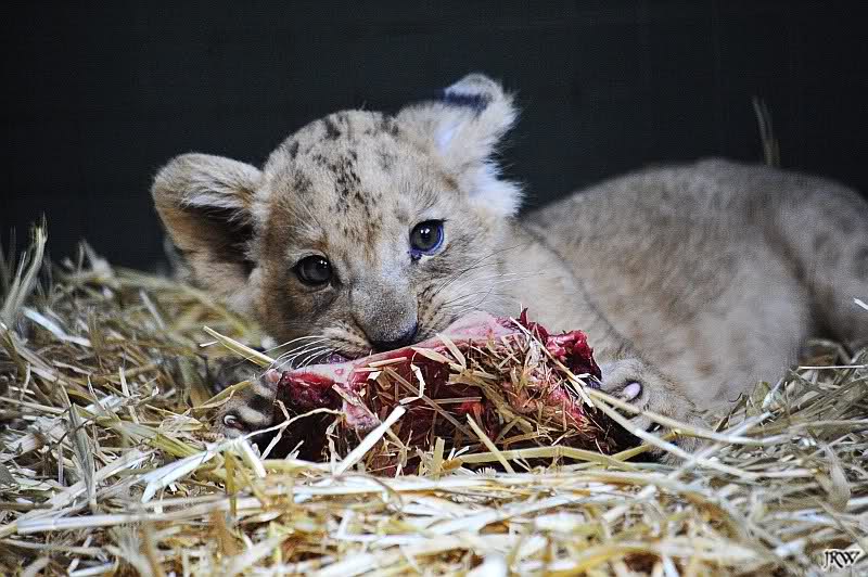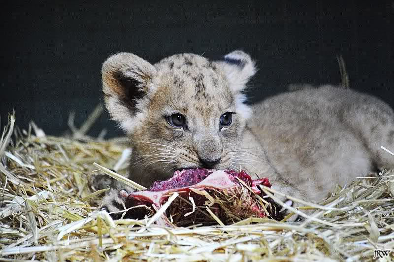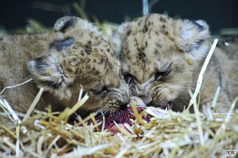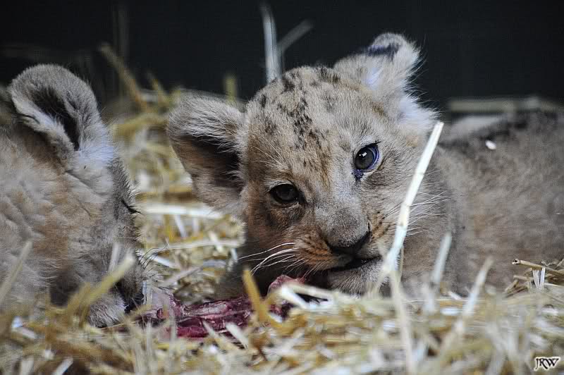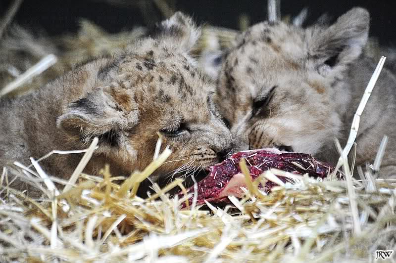 Die Namen der kleinen Löwen wurden heute bekanntgegeben. Das Mädchen heißt Eringa und der kleine Junge Bomani. Die Zufütterung bekommt den Kleinen ausgezeichnet. In den letzten Wochen konnte man die Bäuchlein wachsen sehen und sie sind so energiegeladen wie nie zuvor. Ständig „kämpfen“ sie um etwas. Entweder das Fleisch, die Kordel, die im Käfig hängt oder aber ganz einfach um herauszufinden wer am Stärksten ist. Wäre nicht die Furcht vor ihrer Zukunft, wäre es eine Riesenfreude ihnen zuzusehen. Sie sind wunderschön und drollig dazu.