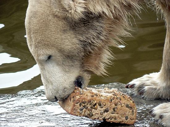 Knut hatte das Croissant schon aufgefressen, bevor er überhaupt aus dem Wasser kam. Dabei fiel ihm der Rest aus dem Maul