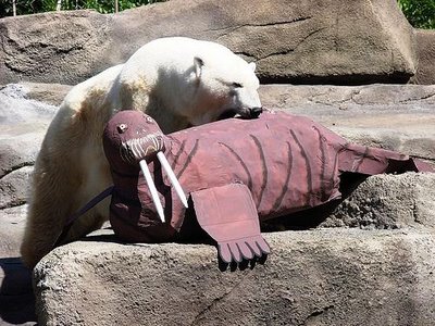 Hierbei handelt es sich um Eisbärin Aurora (*1982) die sich an einem künstlichen (etwas schlanken) Walroß erfreuen darf.