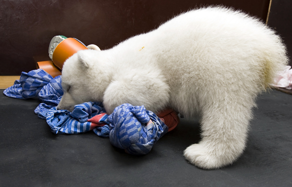 Ich frage mich, ob es immer noch erforderlich ist, dass Flocke derart steril aufwächst. Knut wurde in diesem Alter längst nicht mehr mit Gummihandschuhen angefasst. Und da Knuts Kontaktpersonen auch nicht so penibel ihre Kleidung wechselten, wenn sie zu ihm kamen, wurde Knut auch schon eher mit "Zoogerüchen" konfrontiert.