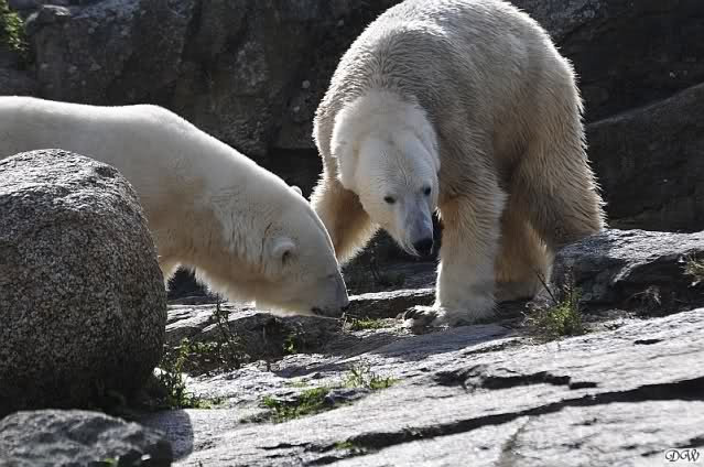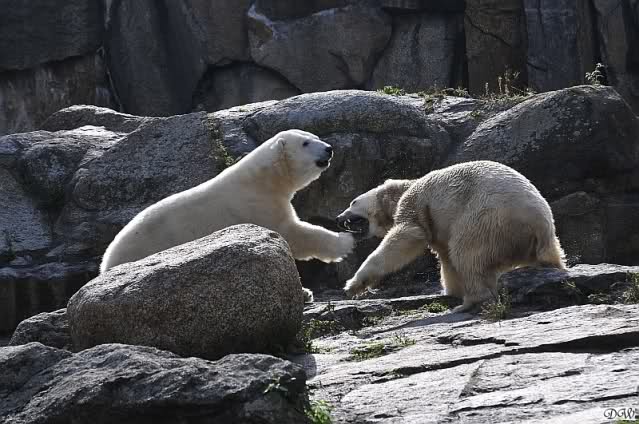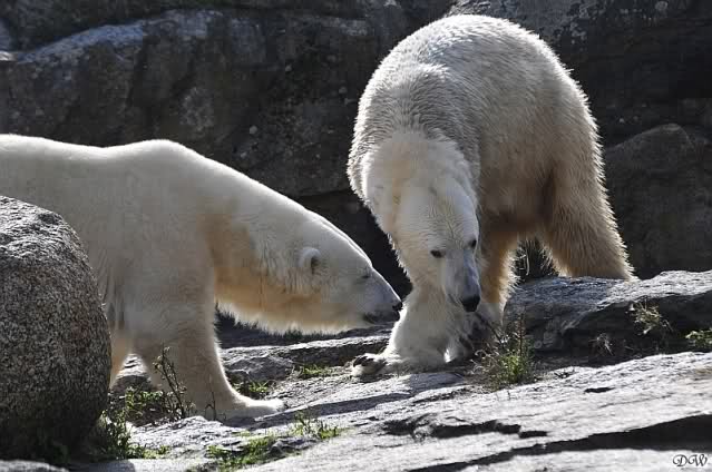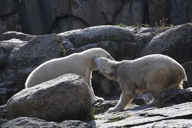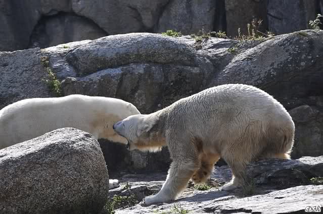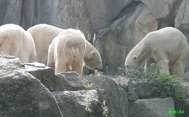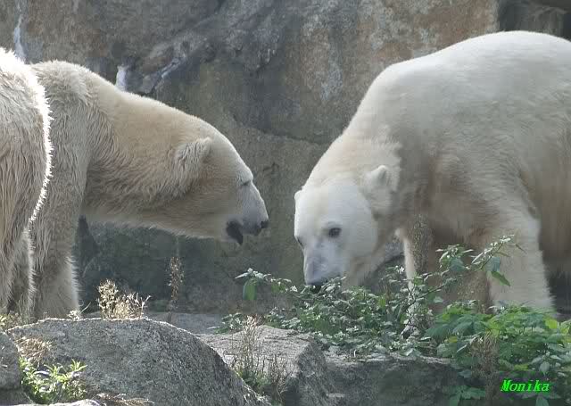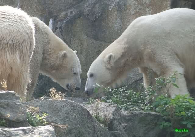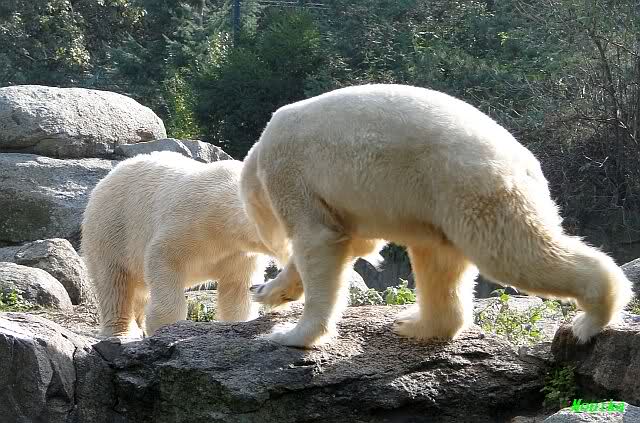 Am frühen Nachmittag lag Knut wieder auf seinem Plateau. Allerdings schien er sich nicht sonderlich wohl zu fühlen. Der Grund war, dass Tosca und Nancy direkt auf dem Felsen über ihm lagen. Immer wieder schweiften seine Blicke nach oben. Endlich standen die Beiden auf und gingen auf die Anlage. Erst wollte Knut ein wenig schlafen, entschied sich dann jedoch über die Anlage zu streifen. Sehr vorsichtig, aber immerhin. Auf einmal kam Katjuscha wie eine Dampfwalze auf ihn zu gerannt. Er brummte sehr laut und sie schlug ihn. Daraufhin biss er ihr in den Hals, aber sehr sanft. Sie rangelten noch eine Weile und dann ging Katjuscha wieder fort. Nancy und Tosca schauten eine Weile zu.
