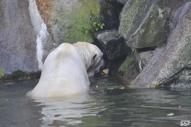 Dann kam Tosca’s Zeit! Sie war ins Wasser gegangen und fand den kleinen Ball mit dem Knut gestern schon spielte. Es war so herzerwärmend dieses Tier spielen zu sehen. Jeder, der die Bilder sieht und keine Freude dabei empfindet, hat ein echtes Problem. Während Tosca spielte, schlich Knut wieder über die Anlage und setzte sich in Kati’s Höhle. Erst als Kati nicht reagierte (sie schaute mit Nancy was Tosca machte), kam er wieder heraus und legte sich auf sein Plateau. Tosca versuchte Nancy ins Wasser zu locken, aber sie war zwar neugierig, mit dem Wasser jedoch hatte sie nichts im Sinn. Tosca kam nach langem Spielen ais dem Wasser, ging direkt zu Knut’s Plateau um zu sehen, ob sie etwas abstauben könnte. Sie konnte! Sie fand ein Grasbüschel, das Knut sich dort hingelegt hatte, und mauste es ihm. Knut war inzwischen auf die untere Kante der Felsen gelaufen und blieb dort lange Zeit. Als Tosca im Wasser spielte, war es im Nu rappelvoll an der Eisbärenanlage.