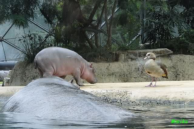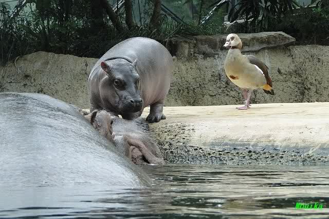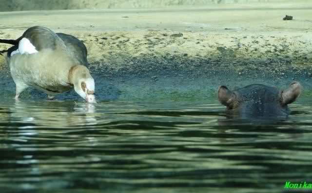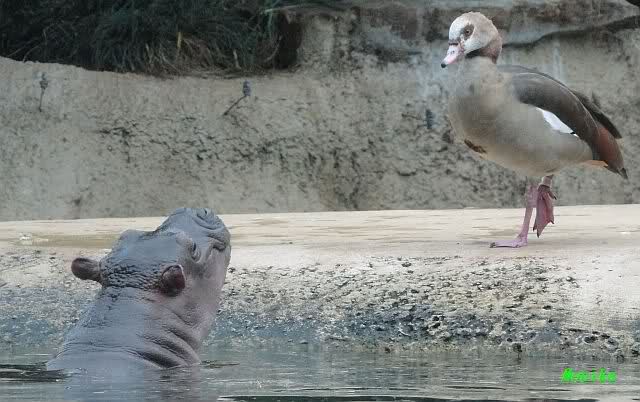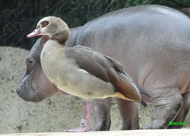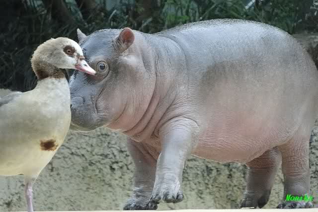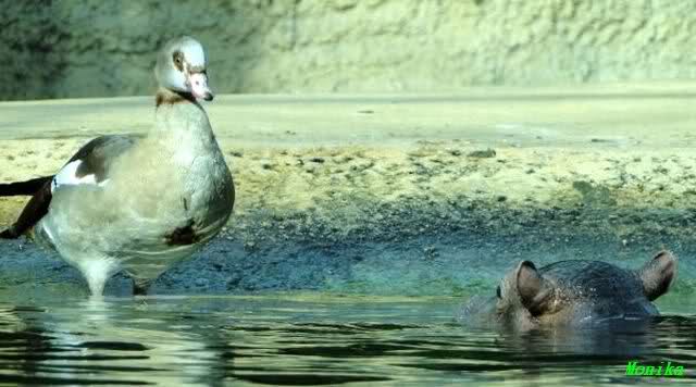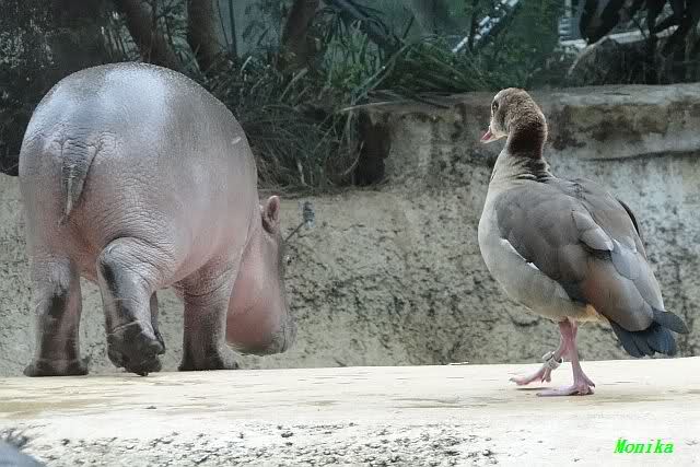 Das kleine Flusspferd guckt fasziniert zur Nilgans.