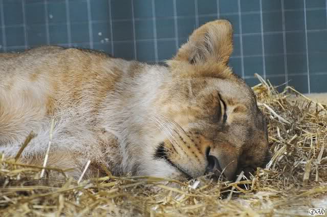 Als wir kurz vor der Schließung noch einmal ins Raubtierhaus kamen, lag Aketi regungslos im Stroh. Aru bummerte an die Tür, die die Käfige trennt. Nach einer Weile stand Aketi kurz auf. Sie lief recht unsicher. Offensichtlich blutet sie noch, denn überall im Stroh war noch Blut zu sehen. Sie legte sich wieder hin und achtete nicht auf das Rufen ihres Bruders. Aus der Wurfhöhle war zu dieser Zeit kein Laut zu hören. Als ich jemanden vom Pflegepersonal darauf ansprach sagte man mir, dass die Kleinen jetzt wahrscheinlich schlafen, denn vor Kurzem hätten sie noch geschrien. Auf meine Frage, ob Aketi die Kleinen versorge, bekam ich ein Achselzucken und die Antwort, dass die Löwin die meiste Zeit im Käfig verbringe. Ob die Babys von den Pflegern gefüttert werden, konnte ich nicht in Erfahrung bringen.