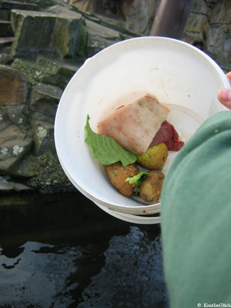 Damit mal so ein kleiner Eindruck entsteht, was denn Knut so zu fressen bekommt, hier ein Blick in den halb leeren Eimer. Weintrauben, Fisch, Apfel und auch etwas Salat hat Knut schon bekommen.