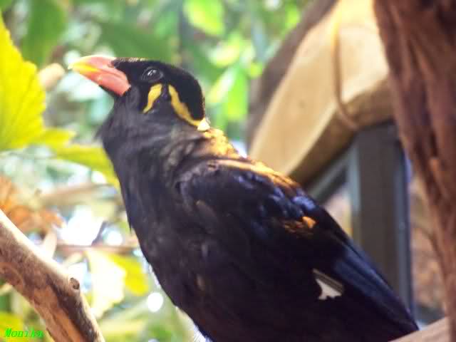 Der Beo lebt im Urwaldhaus und kann sprechen.