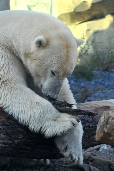 Giovanna schnappt sich eine große Bürste und stemmt sich aus dem Becken. Dann schleudert sie ihr Spielzeug durch die Luft und wirft sich hinterher. Als die zweijährige Eisbären-Dame rücklings ins trübgrüne Wasser platscht, jauchzen die Kinder am Beckenrand begeistert auf. Im Inneren des Eisbärengeheges geht es ruhiger zu. Männchen Yoghi (8) verspeist genüßlich einige Fische. Lisa, die 35-jährige Großmutter des berühmten Knut aus Berlin, schläft.