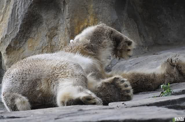 Doris, Perhaps this is a stupid idea, but...it seems from looking at yours and others photos that a major sticking point in Knut's and Gianna's relationship is the sand bed. At least a day or so ago, whenever Gianna approached the sand bed, especially from the moat, Knut's head turned to the side and his lip became very long. Of course, this has always been his sand bed and the one he played on with Thomas. Do you think there is enough room for two sand beds on the enclosure? Do you think it might help to have two sand beds? Just a thought...
