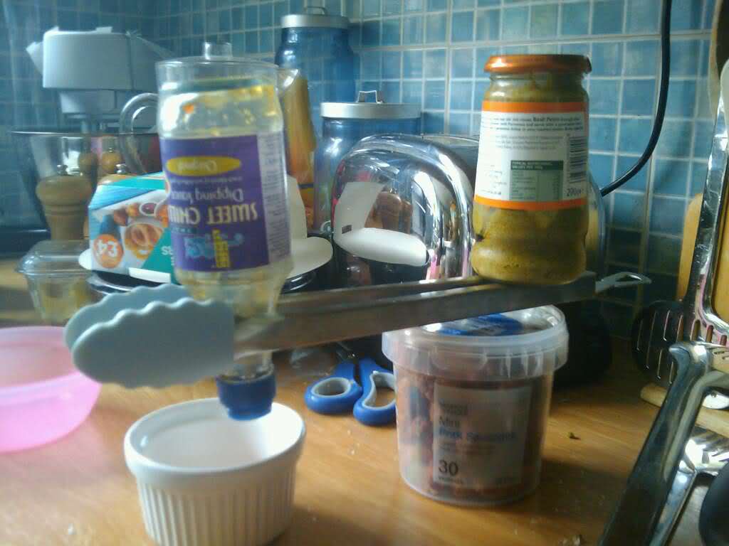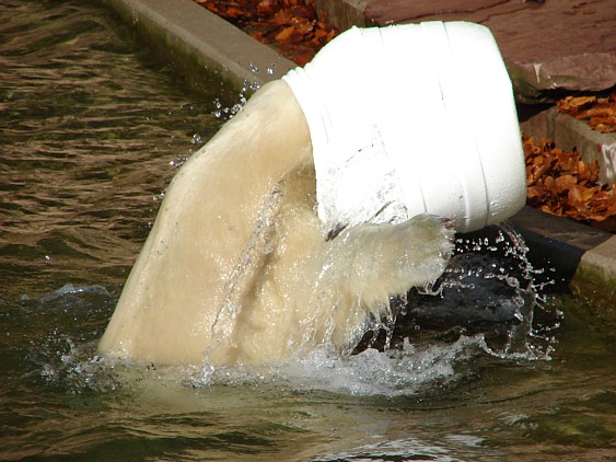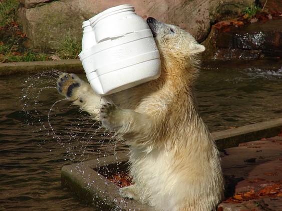 Flocke kam danach wieder ins Gehege und von da an war Spaß angesagt. Witzigerweise scheint Flocke ihr Fleisch lieber zu haben, wenn sie es erstmal tüchtig eingeweicht hat. Sie hat auch, statt das frische Fleisch aufzufressen, immer wieder ältere Fleischreste und Fische vom Grund des Beckens hoch geholt. Ansonsten war sie die meiste Zeit mit ihrer weißen Plastiktonne zugange, die sie unermüdlich malträtiert hat. Auch Besuche an der Zwischentür zu Vera waren wieder angesagt, die von dieser mit Schlägen gegen die Tür und nicht sehr freundlichem Gebrumme quittiert wurden. Flocke schien davon aber nicht wirklich beeindruckt, man gewöhnt sich halt an alles Und was mir heute aufgefallen ist, Flockes Zunge wird langsam blau, das sieht witzig aus, weil es nicht einheitlich passiert, sondern sich Flecken bilden, wie man auf meinen Fotos sehen kann. Ich hab etwa zwei Stunden bei ihr verbracht und als ich gegangen bin, war sie immer noch lustig am Spielen, das Mädchen hat definitiv Energie