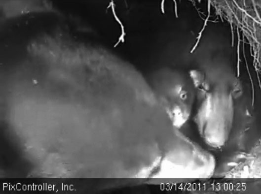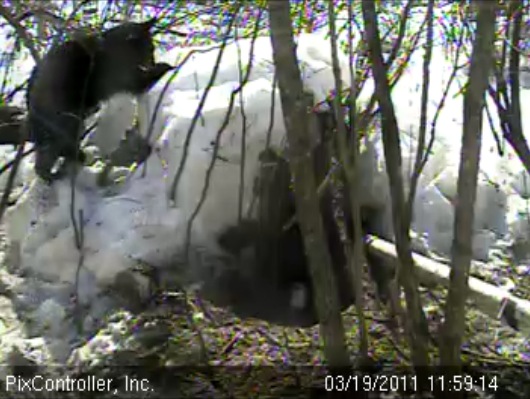 Heute fand Hope ein paar Erlenkätzchen und Knospen zum Fressen. Lily grub durch den Schnee bis auf die Erde darunter. Wir fragen uns, was sie dort fand. Wir drehten die PTZ Kamera um Lily zu finden, deren Spuren wir verloren hatten und waren überrascht, sie bei der Inspektion der Kamera zu finden, als wir sie wieder zurückstellten. Die Kamera macht wahrscheinlich ein Geräusch wenn sie sich bewegt und das hat ihre Aufmerksamkeit erregt. Lily und Hope wagten sich weg von der Höhle, einen weiten Weg in Richtung einer großen Zeder die ein potentieller Schlafbaum ist. Lily bahnte sich einen Weg durch den Schnee und Hope folgte ihr in ihren Fußstapfen. Videos von heute werden unter ‚bearstudy‘ auf YouTube gepostet. Das erste ist