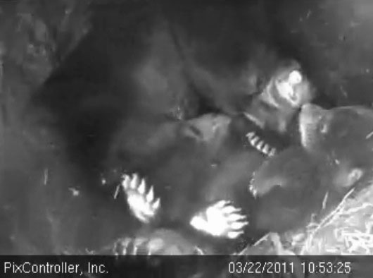 Wir beobachten wie die motorischen Fähigkeiten der Jungen sich verbessern. In einer Woche werden sie so alt sein wie Hope war, als sie sich das erste Mal aus der Höhle trollte am 21. März. Ihr nächstes derartiges Unternehmen war nicht vor dem 29. März. Am 30 März trainierte sie auf Bäume zu klettern und am 1. April verließ sie endgültig die Höhle.