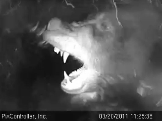 Sie ist auch unartig. Sie hat sie Linse wieder abgeleckt obwohl wir sie ein paar Inches weiter in die Röhre gesteckt haben. Sie hat natürlich eine lange klebrige Zunge zum Lecken von Ameisenlarven und dem Erreichen von anderem Futter in einer wunderbar aussehenden Art. Kurz bevor sie die Höhle zurück in ein verschwommenes Niemandsland verwandelte zeigte Hope uns dagegen den Innenraum ihres Maules ihre neuen gut wachsenden Eckzähne. Das bewies das gute Wachstum und den Unterschied zu unterernährten Bären, die manchmal ihre Baby-Eckzähne bis zu diesem Alter haben.