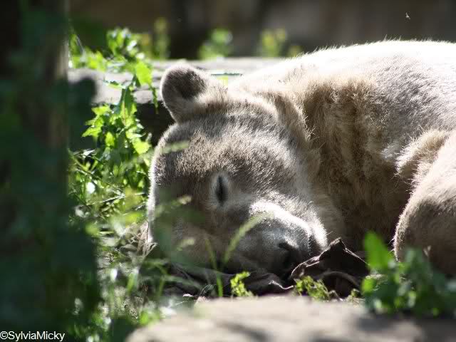 Die Eisbären haben heute anscheinend Äste zum Spielen bekommen. Nancy und Katjuscha lagen nämlich jede auf einer Insel und schliefen. Dabei hielten beide liebevoll einen Ast an sich gedrückt.
